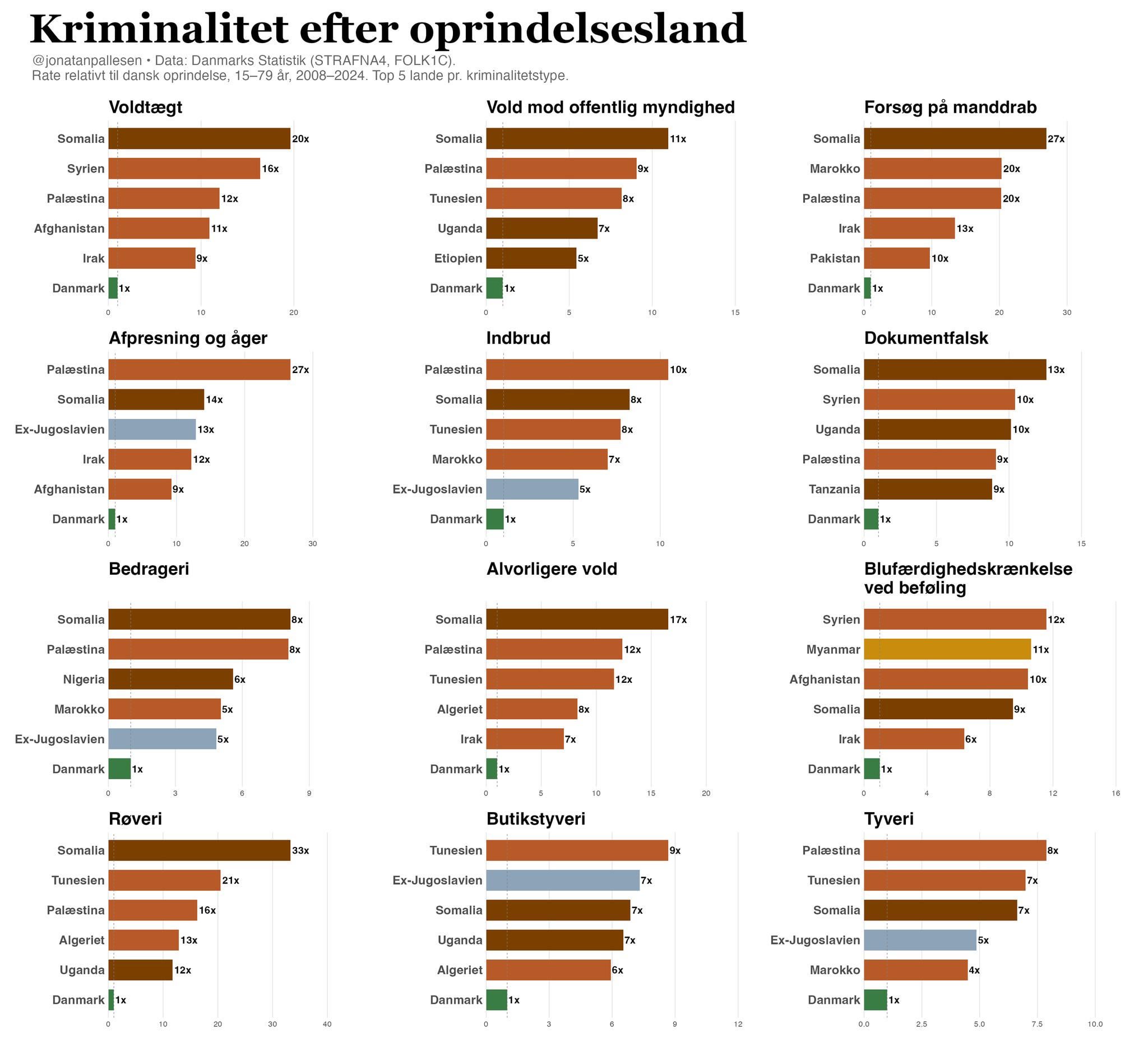 Noget af det, der virkelig skævvrider sådanne statistikker er, hvor lidt kriminalitet der er i Danmark. Danmark er et af verdens mest fredfyldte lande i verden, hvis ikke det mest fredfyldte. Det betyder, at der ikke skal særligt meget til, for at raterne ser fuldstændigt fanatiske ud. Læg oveni dette, at befolkningsgruppernes størrelse, også betyder noget. Hvis der kun er 4 canadiere i Danmark, og 2 af dem begår kriminalitet, er det lige pludselig 50% af canadiere i Danmark, der er kriminelle. Endvidere *kan* (og bliver) information i denne form, anvendt til at retfærdiggøre forestillinger om kriminalitet som noget iboende i bestemte befolkningsgrupper, grundet deres ophav. En idé, man ellers helst skulle have forladt i forrige århundrede.