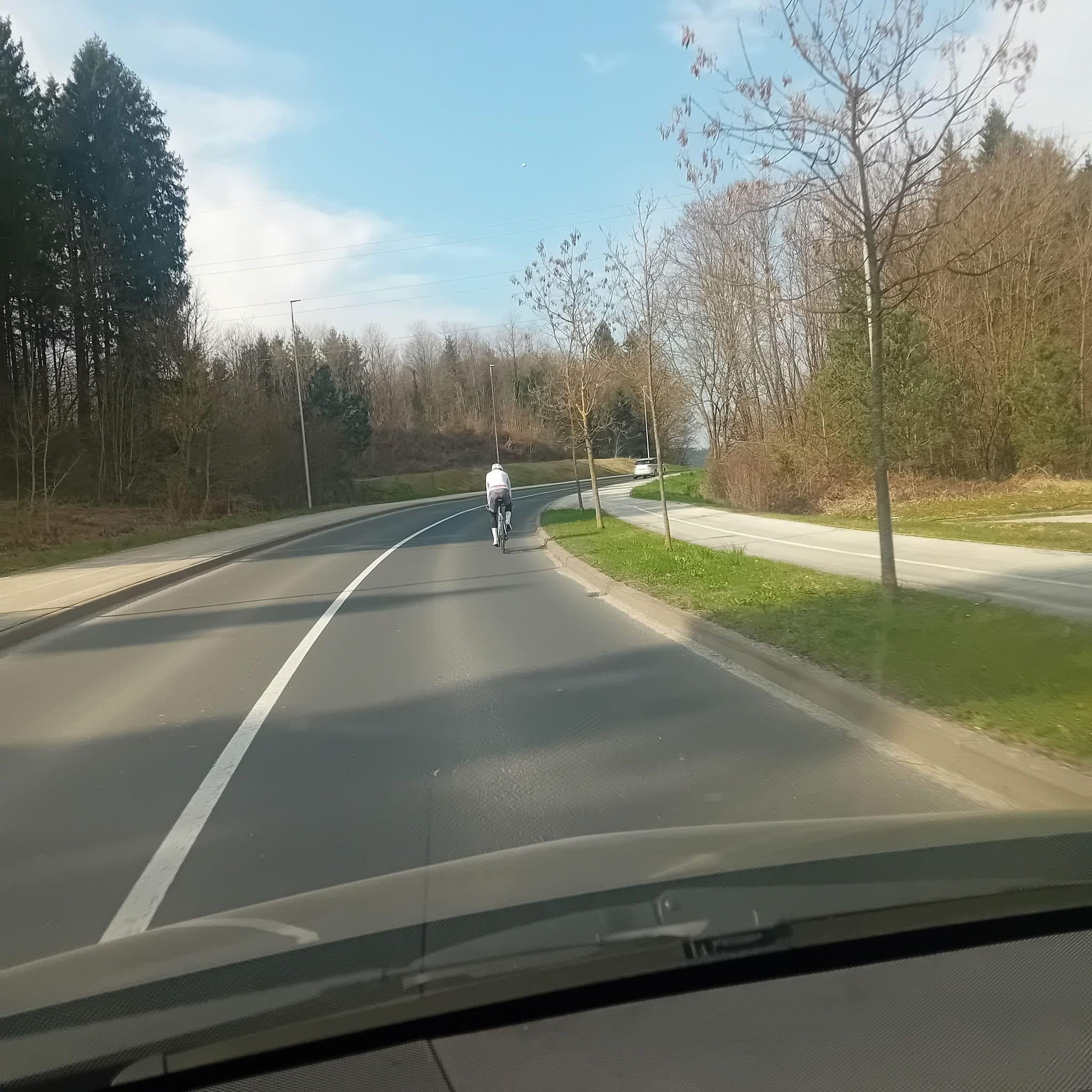 Ozka cesta, polna črta, omejitev hitrosti več kot 50kmh zraven pa kolesarska. Za take primere bi prav prišle registrske tudi na kolesih, da se takim prepove kolesarjenje.