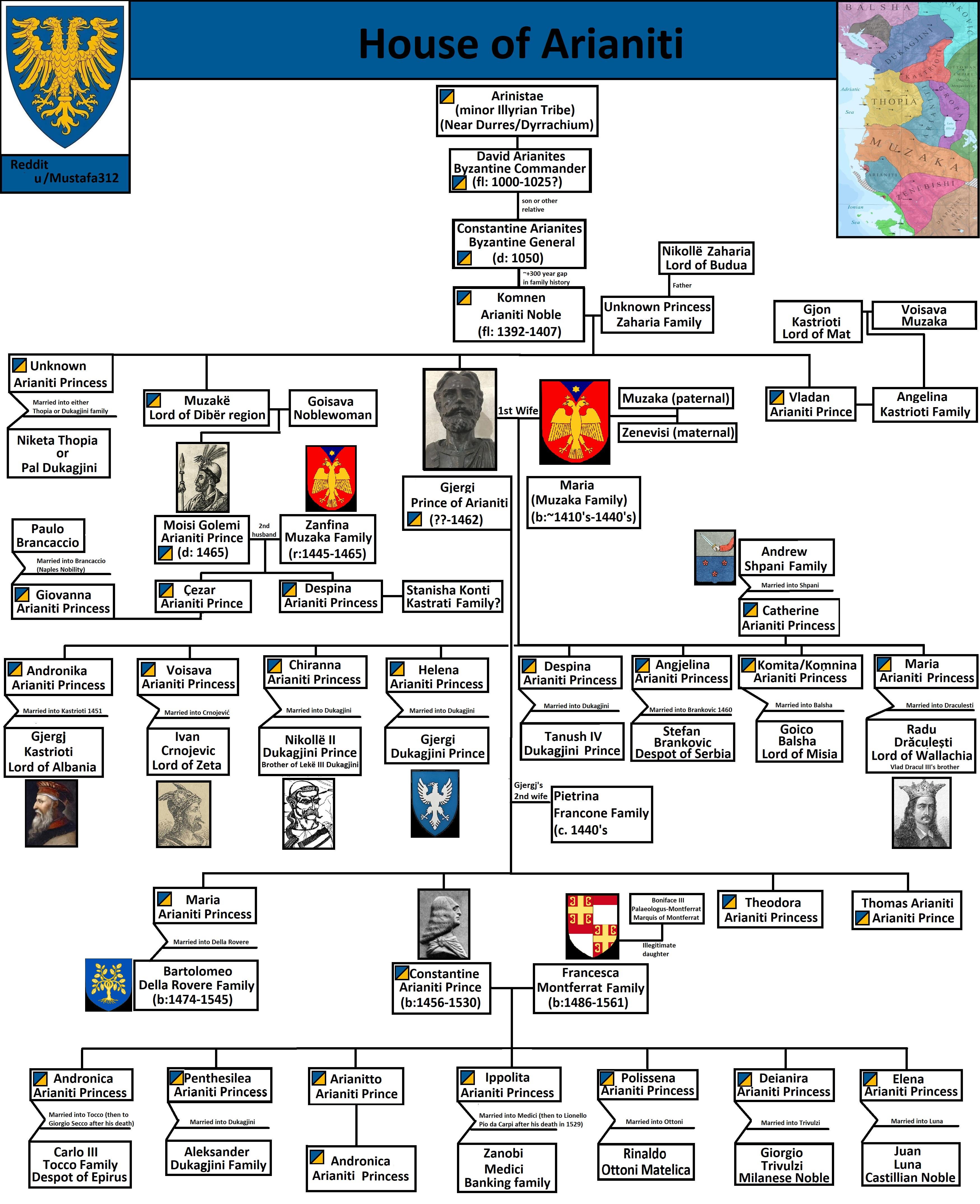 La prossima famiglia su cui mi sono concentrato è la famiglia Arianiti. Questa famiglia era come una fabbrica per creare principesse. Sono rimasto stupito da come fossero sposati in così tante famiglie. Da Gjergi Kastrioti a Radu Draculesti alla famiglia Medici d’Italia. Comunque molto interessante. Spero che ti piaccia! Ho incluso una mappa nell’angolo per visualizzare dove gli Arianiti occupavano il territorio e chi erano vicini. Fatemi sapere se avete domande e scusate eventuali errori di battitura o errori che ho fatto.