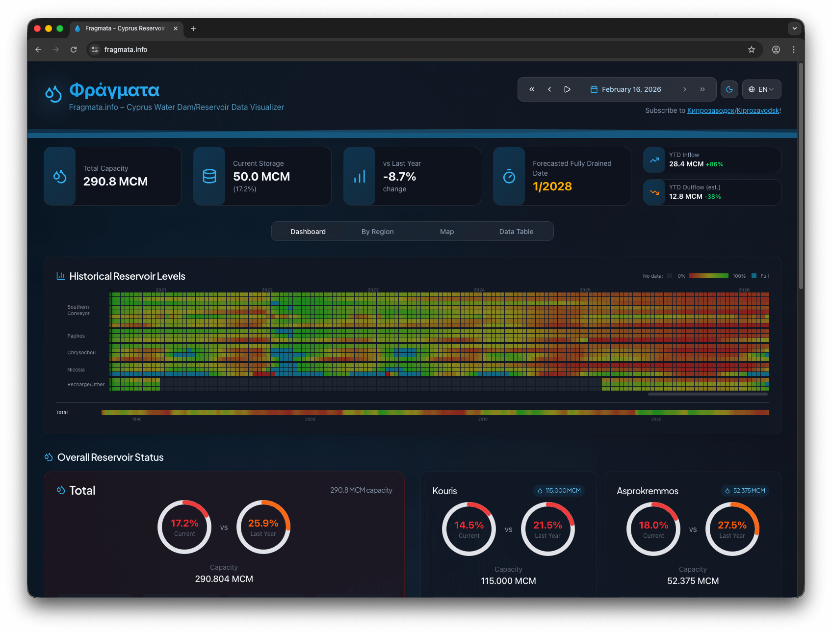 Tuttavia non ci sono ancora tutte buone notizie. Achna è al 2,1% con afflussi pari a zero per l’intero anno. Kalavasos 8,4%, Leucade 12,3%. Le dighe della pianura sudorientale semplicemente non ricevono la pioggia dei Troodos. Il taglio dell’acqua del 10% è ancora in vigore in tutta l’isola.