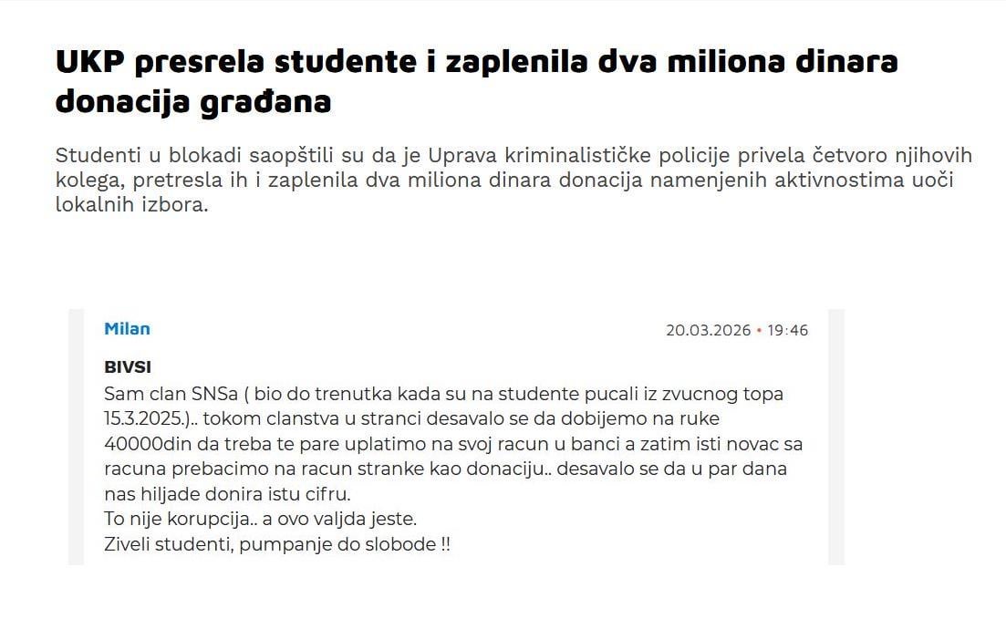 Mislim da je ovde problem sto SNS moze da dokaze poreklo novca a studenti ne. Totalna pravna zajebancija koliko sam ja razumeo. Ispada da se na hiljade raznih donacija koje se organizuju lokalno gleda blagonaklono a kada to urade studenti onda se maše zakonom.