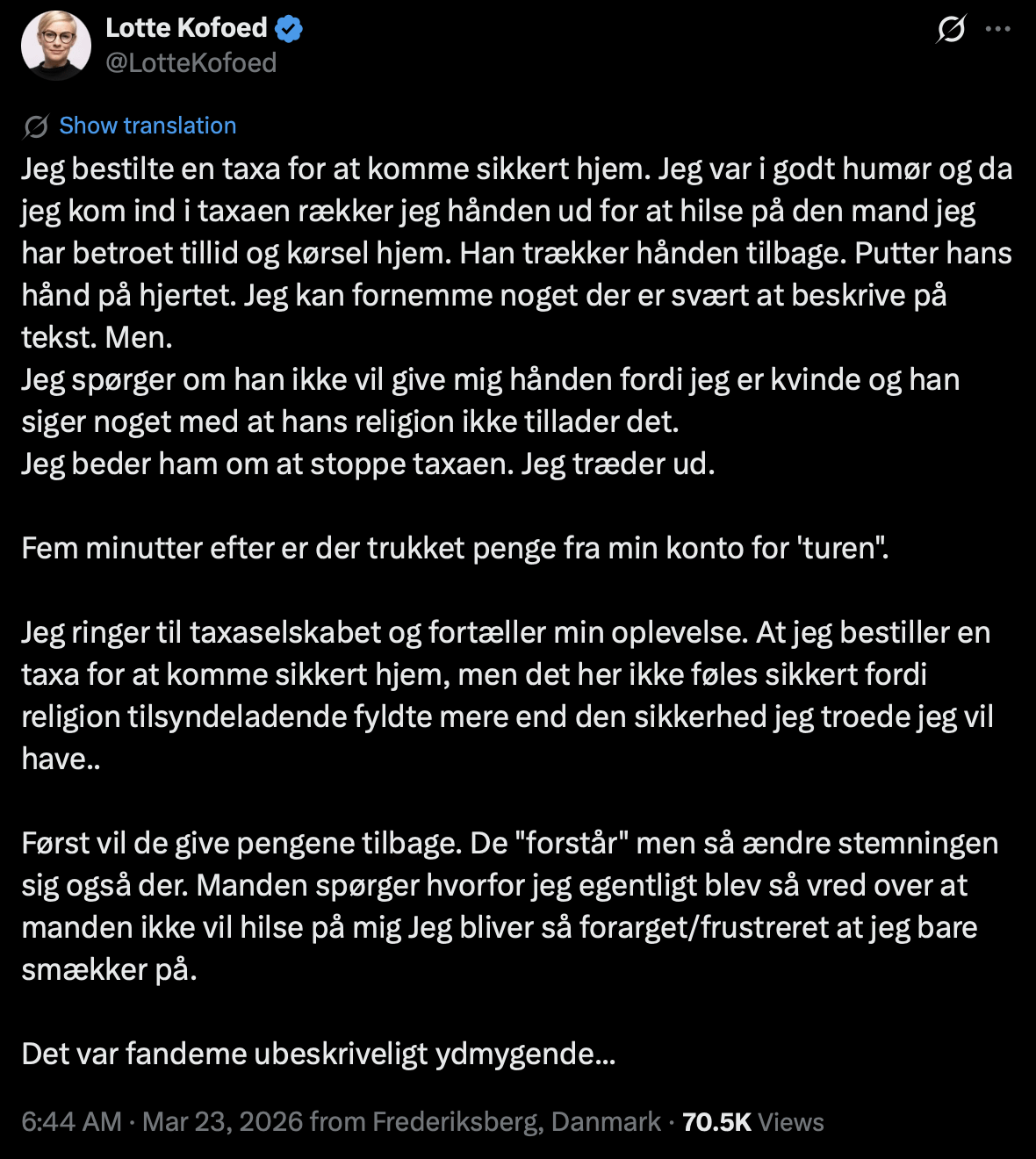 Et underligt opslag. Har aldrig givet hånd til en taxachauffør, og er det ikke et racistisk opslag?🙄Og en SF’er forventes da at have respekt for alle mennesker, uanset religion. Lotte Kofoed er en dårlig reklame for SF. 🫩