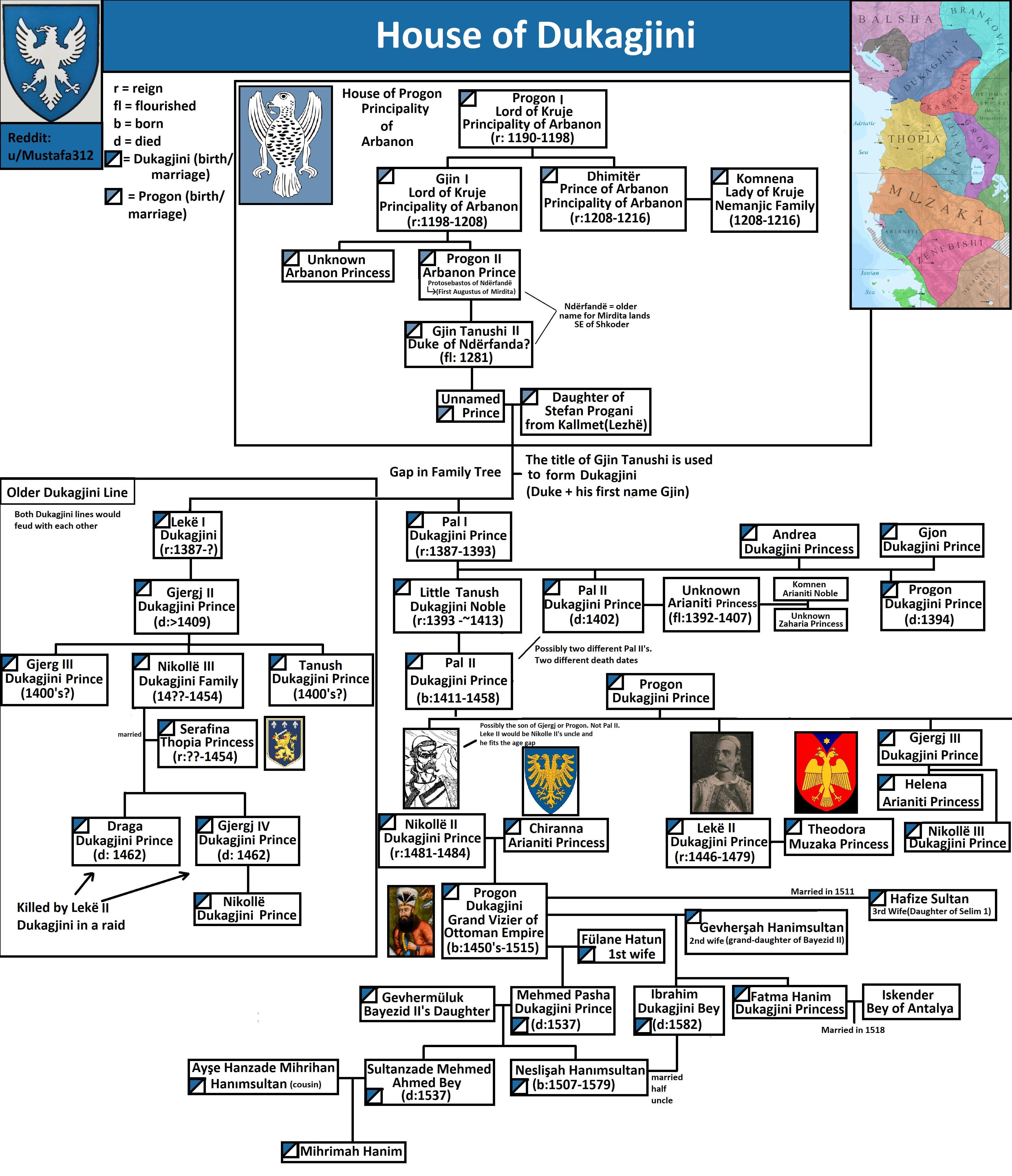 Questo mi ha fatto venire un gran mal di testa. C’erano così tanti nomi ripetuti, duplicati ed errori sulle pagine di Wikipedia che mi sentivo come un investigatore che svela un enorme mistero. Comunque questa è la famiglia Dukagjini che si dice sia emersa dalla linea della famiglia Progon. Ci sono molte lacune e parti confuse su chi è o chi è parente, ma ho fatto del mio meglio per metterli insieme in ciò che ha il senso più logico. Si prega di porre domande poiché alcune informazioni di base non sono incluse. Questa famiglia è stata incredibilmente interessante da ricercare, quindi sono più che felice di spiegare alcune cose in modo più dettagliato. Mi prenderò una piccola pausa dopo questa. La famiglia Muzaka è probabilmente il prossimo progetto.