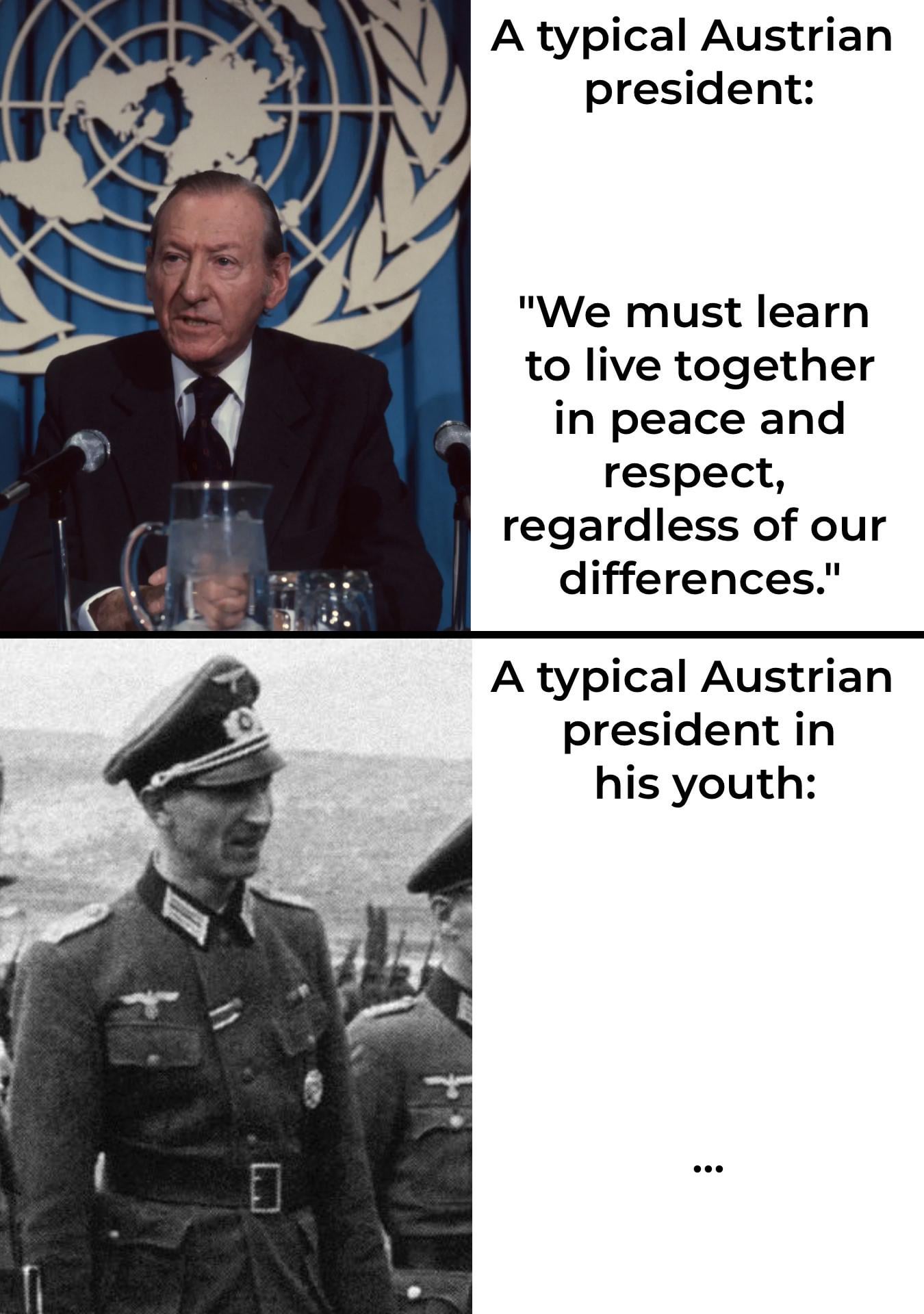 Kurt Waldheim – Ufficiale di stato maggiore della Wehrmacht della Seconda Guerra Mondiale nei Balcani durante le operazioni che comportavano deportazioni di massa (~ 50.000 ebrei da Salonicco, la maggior parte uccisi). Nessun crimine diretto provato. Successivamente segretario generale delle Nazioni Unite e presidente dell’Austria.