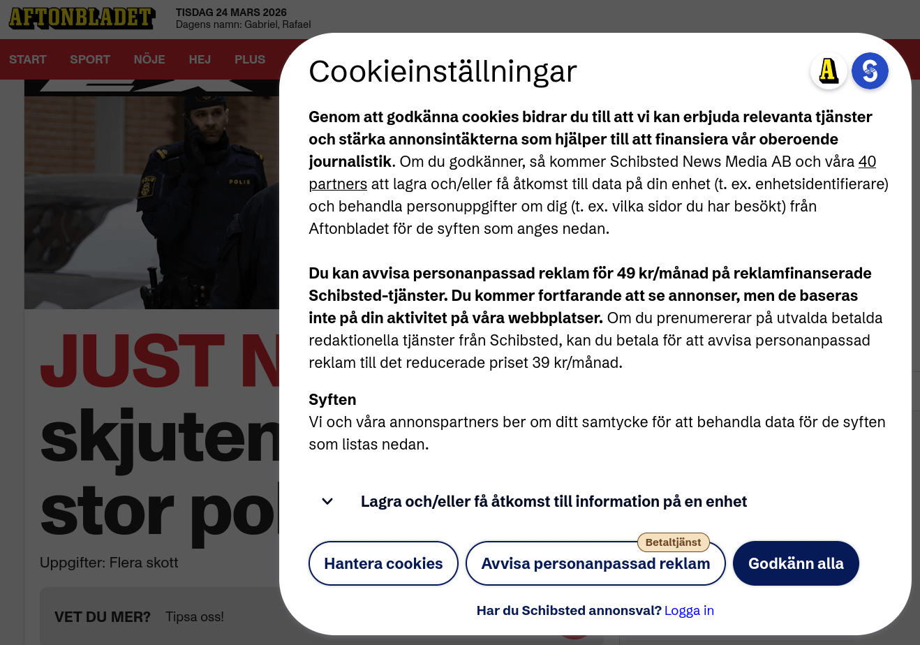 Har själv inte fått upp sådan ruta men vad händer om man skulle trycka på “hantera cookies”? Går det inte att ta den vägen för att neka valfria cookies och bara godkänna nödvändiga?