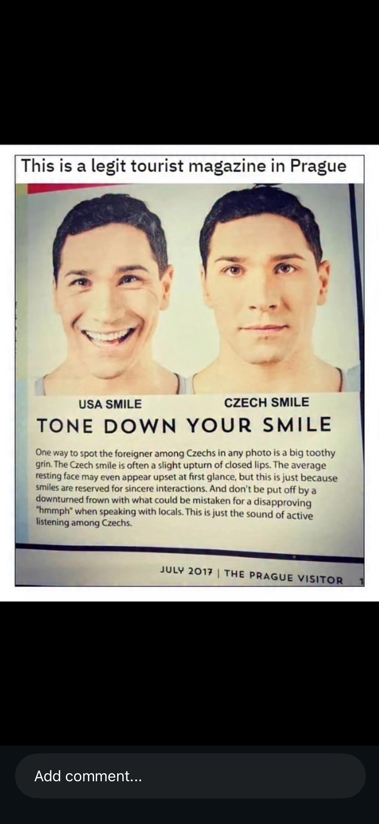 I’m American and have plenty of Czech aquintances who will give a confident smile and some who don’t. I don’t really understand this perpetual narrative nor do I like the terminology of “reserved for sincere interactions”, sounds kind of holier than thou’.
