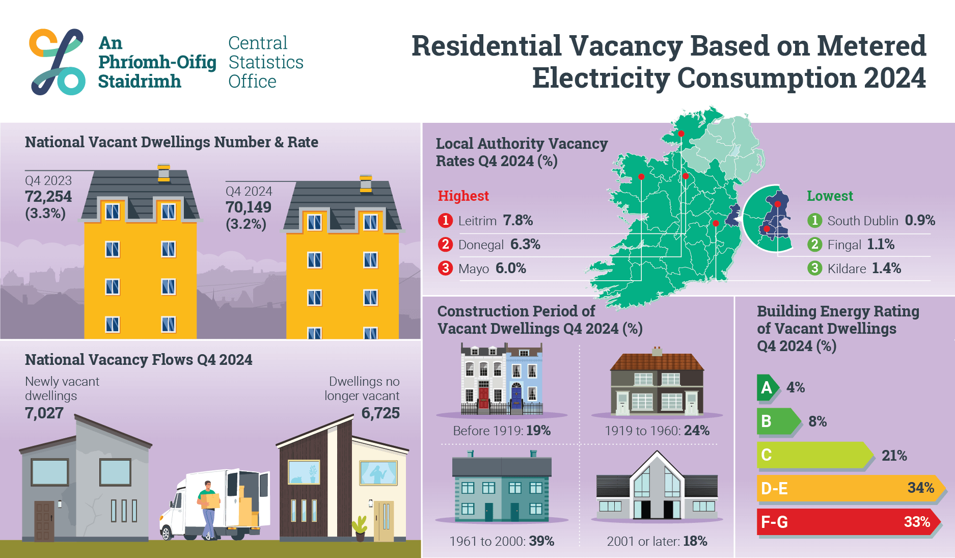 * In Q4 2024, 33% of vacant dwellings had a Building Energy Rating (BER) rating of F or G where a match could be made to a BER assessment.