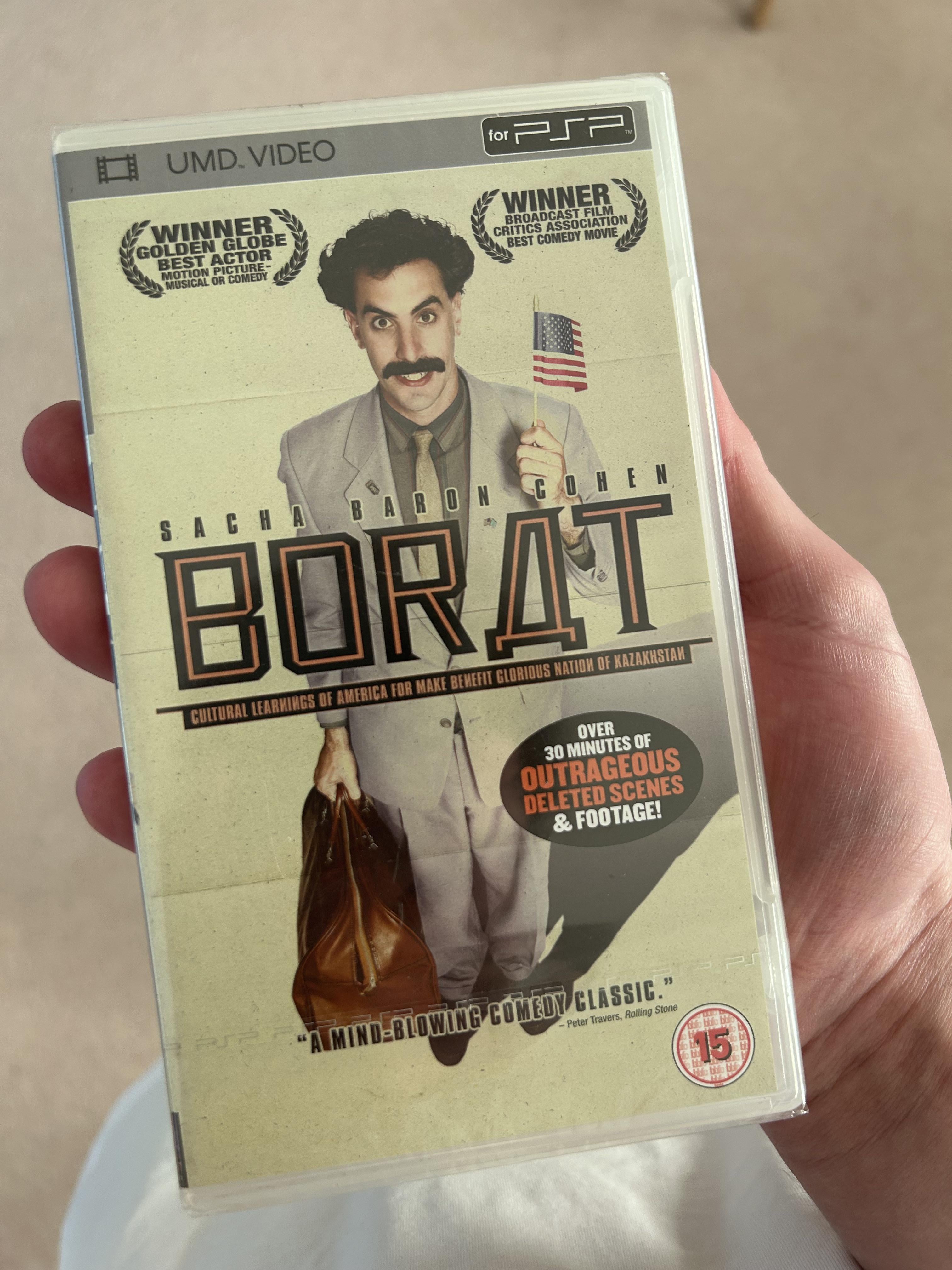Recentemente ho trovato nella mia confezione un film Borat nuovo di zecca sigillato per la console PSP (ho ordinato una console Psp nuova di zecca dal Vietnam con pochi giochi)