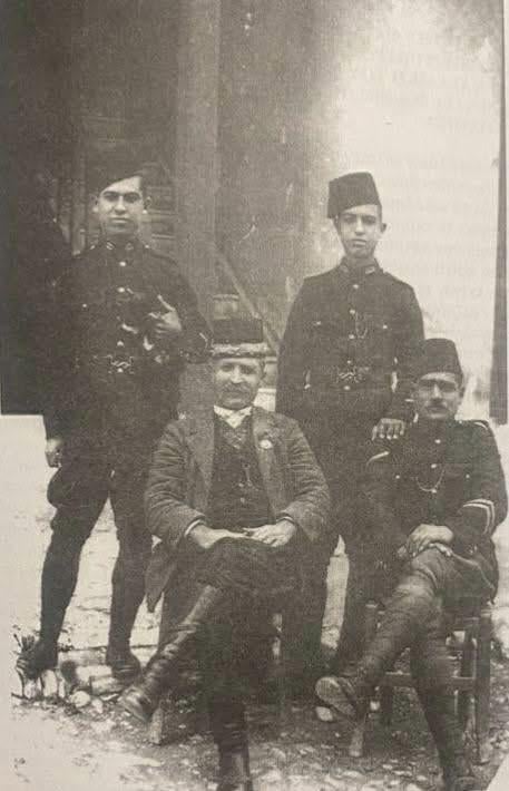 Negli anni ’30, il capo villaggio di Lefkara, Halil Mustafuri, è seduto davanti a sinistra, accanto a lui c’è il caporale Niyazi Enver di Aynikola (Agios Nikolaos), e in alto a sinistra c’è Mehmet Selçuk di İpsillat (Psyllatos)