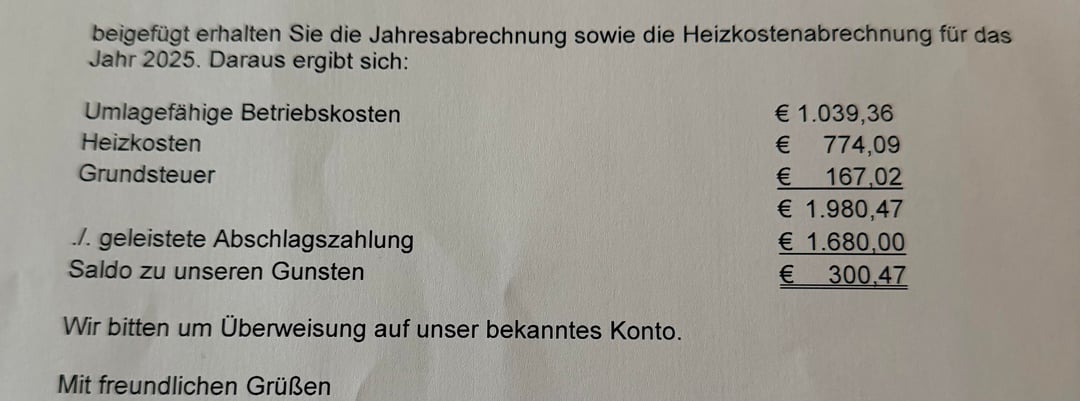 You’re already paying a portion of this every month along with your rent. The first page is the most important one for you. That’s where all the costs are totaled. You need to pay your landlord an additional €300.47.