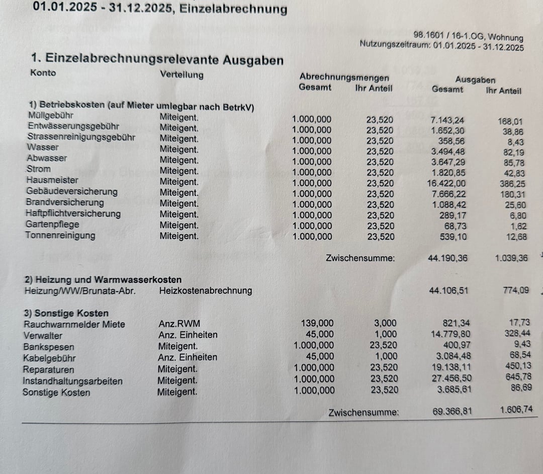 Sono in Germania da poco più di un anno e ho già ricevuto il jahreskosten Abrechnung dal mio Vermieter. Qualcuno potrebbe dare un’occhiata veloce per vedere se sono legalmente tenuto a pagare per tutto ciò che è elencato? Sto cercando di capire con l’intelligenza artificiale e la ricerca ma non mi fido dei risultati.