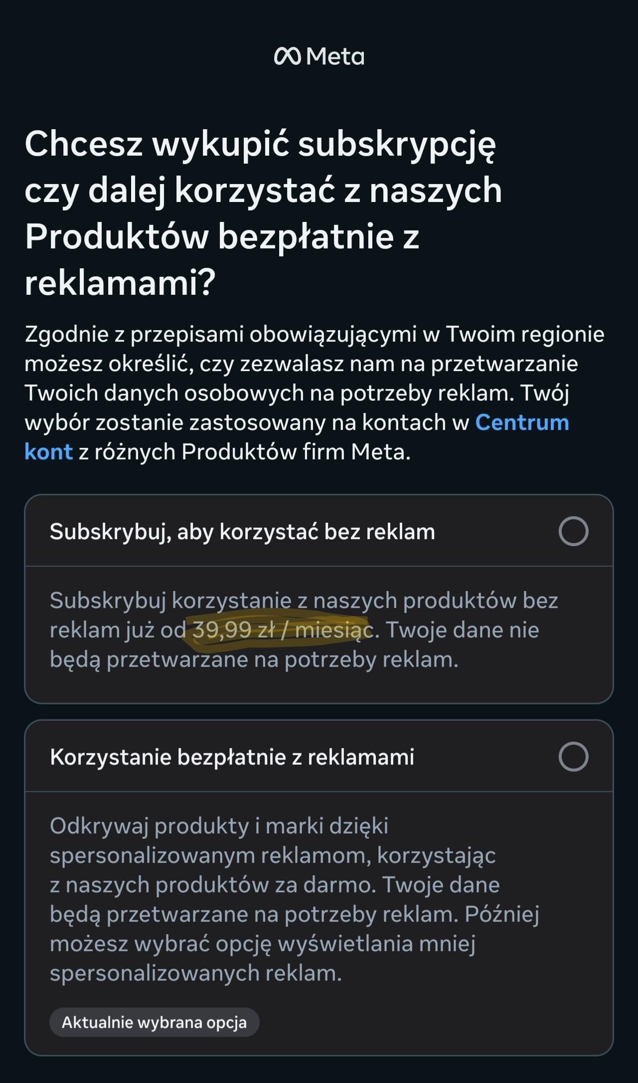 IMO cena jest specjalnie zaporowa (kto zapłaci tyle za subskrypcję umierającego fejsbuka i Instagrama), żeby kupczyć naszymi danymi 🙁