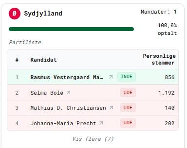 Un esempio dell’importanza di utilizzare una lista di partito come forma di accordo, invece che fianco a fianco come fanno la maggior parte: nello Jutland meridionale, Selma Bolø non è stata selezionata per Enhedslisten, nonostante abbia effettivamente ricevuto più voti personali di Rasmus Vestergaard.