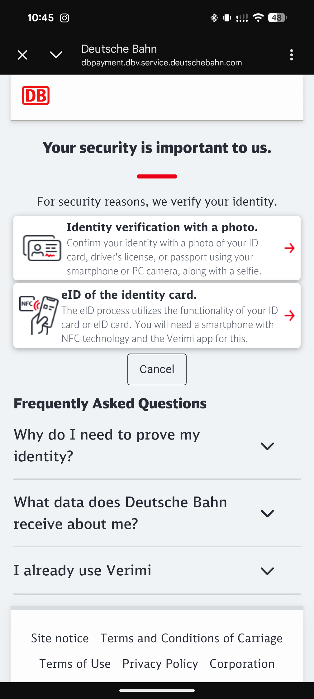 Stavo cercando di prenotare un biglietto ICE e all’improvviso l’app ha chiesto di scansionare il mio documento d’identità. Si è caricato normalmente, ho provato a scansionarlo ma non è andato a buon fine, si è bloccato, l’app diceva che i biglietti non potevano essere confermati. Ho riprovato, ho pagato normalmente senza documento d’identità e il mio biglietto è stato acquistato. Quello che è successo? E’ nuovo? Era l’app DB ufficiale e la cosa di verifica aveva il loro logo, ma ora sono così stranito che mi sento come se avessi condiviso il mio ID con qualche sito web dannoso. Qualcuno ha qualche esperienza con qualcosa del genere?