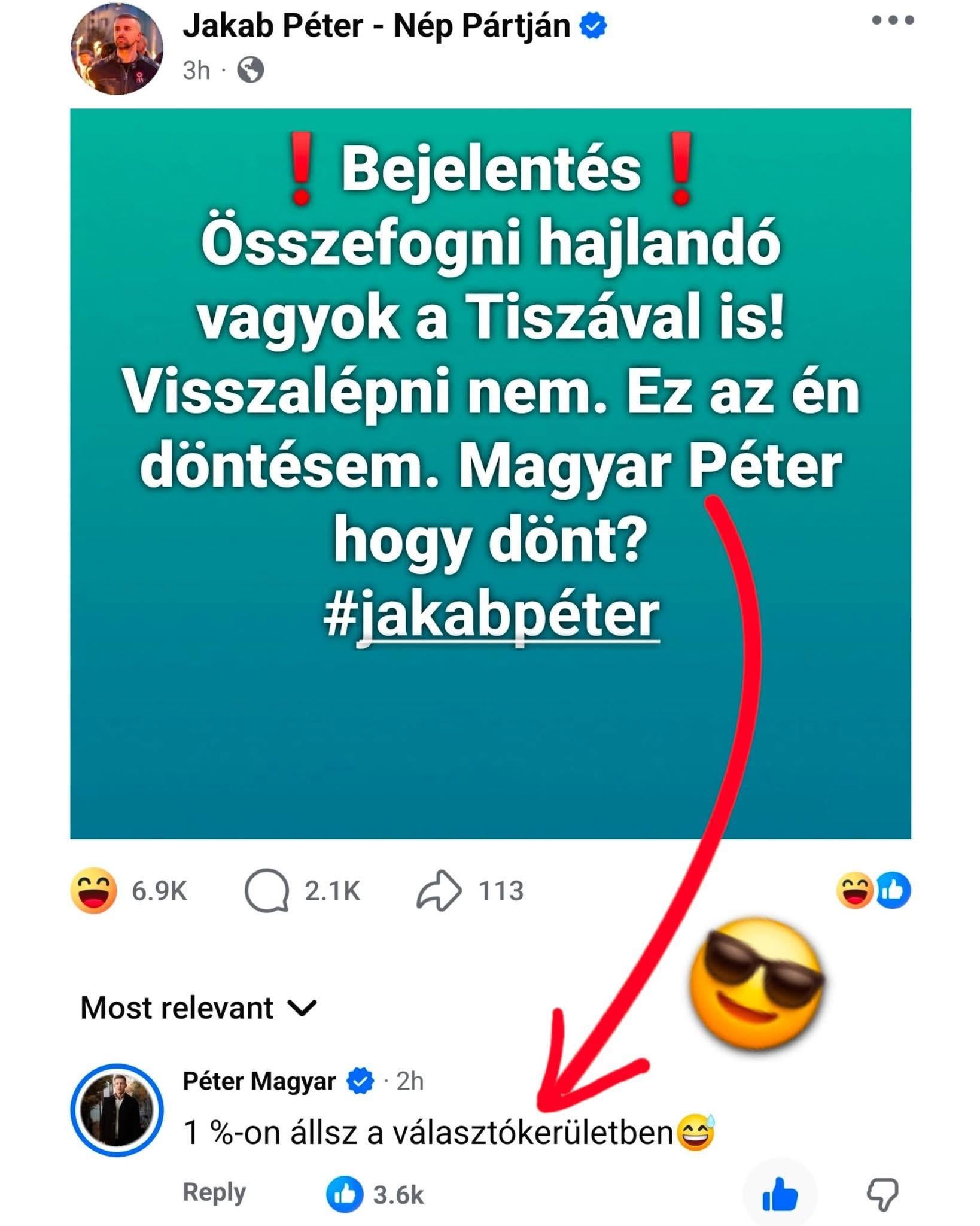 Jákob Péter azt reméli, hogy ez a facebook poszt sok reakciót ér el, mert neki fejben az van meg, hogy az egyenlő a szavazatok számával.