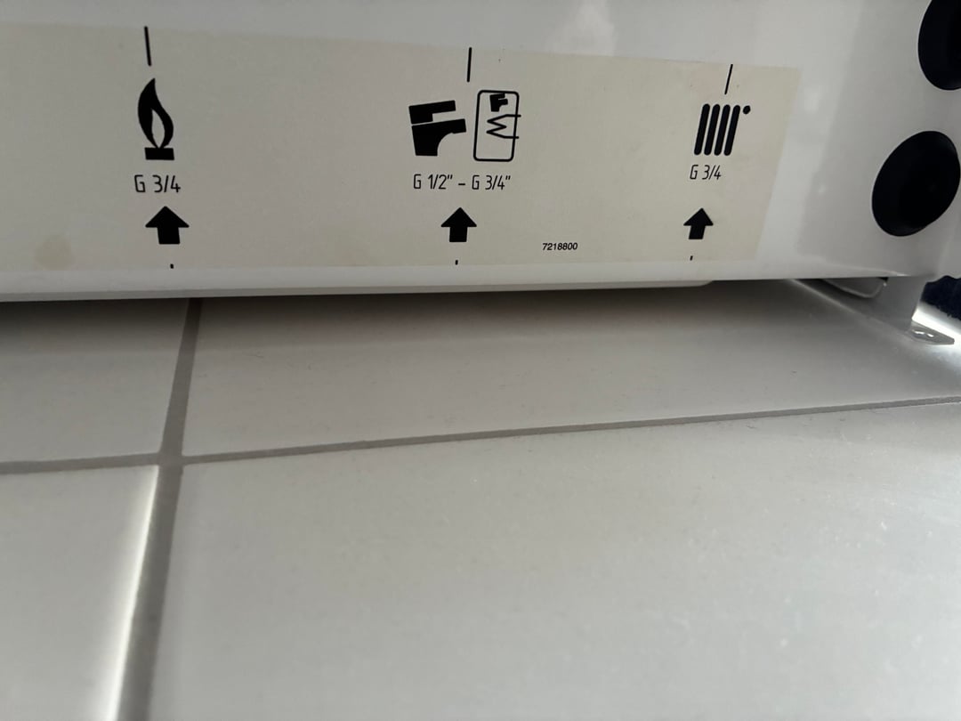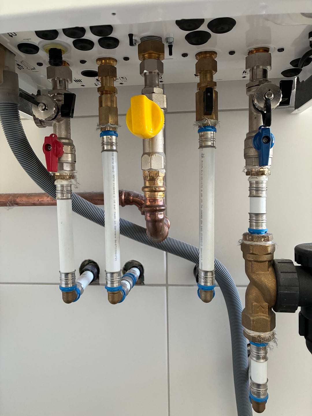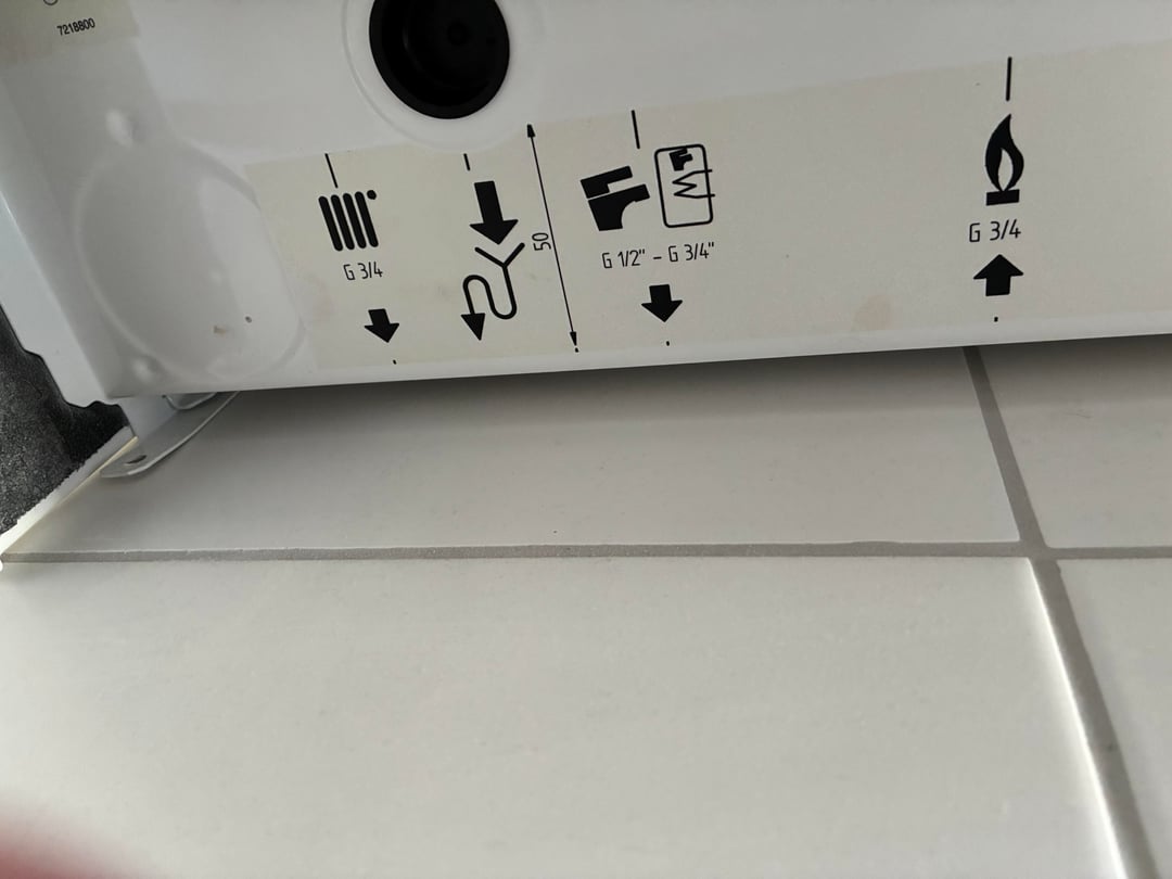 Middle yellow is gas, blue is fresh water going in, red is hot water goong out. The two pipes in between are the two pipes leading into and out of the heating circle.