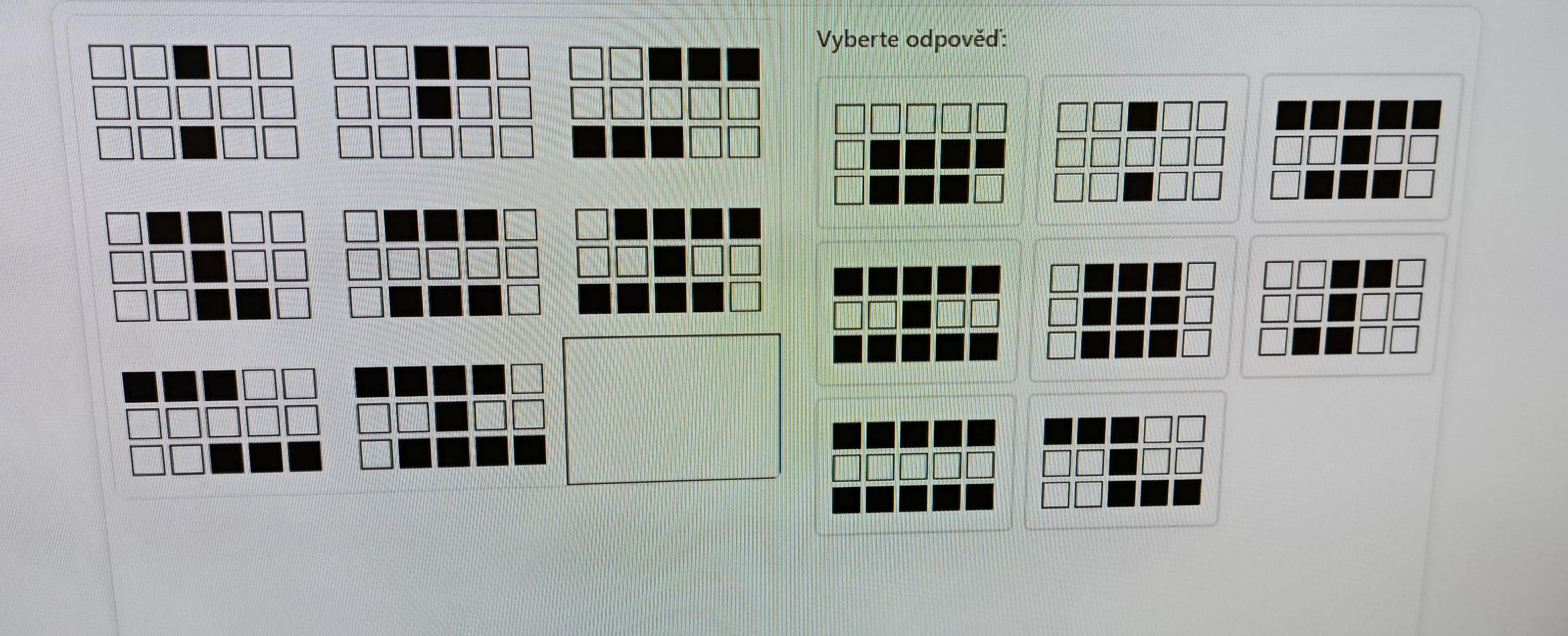 Po pravdě si myslím, ze zadání je lehce špatně. Druhý čtvereček na prvním řádku by měl být odpověď č. 6, protože tam chybí spodní řádek.