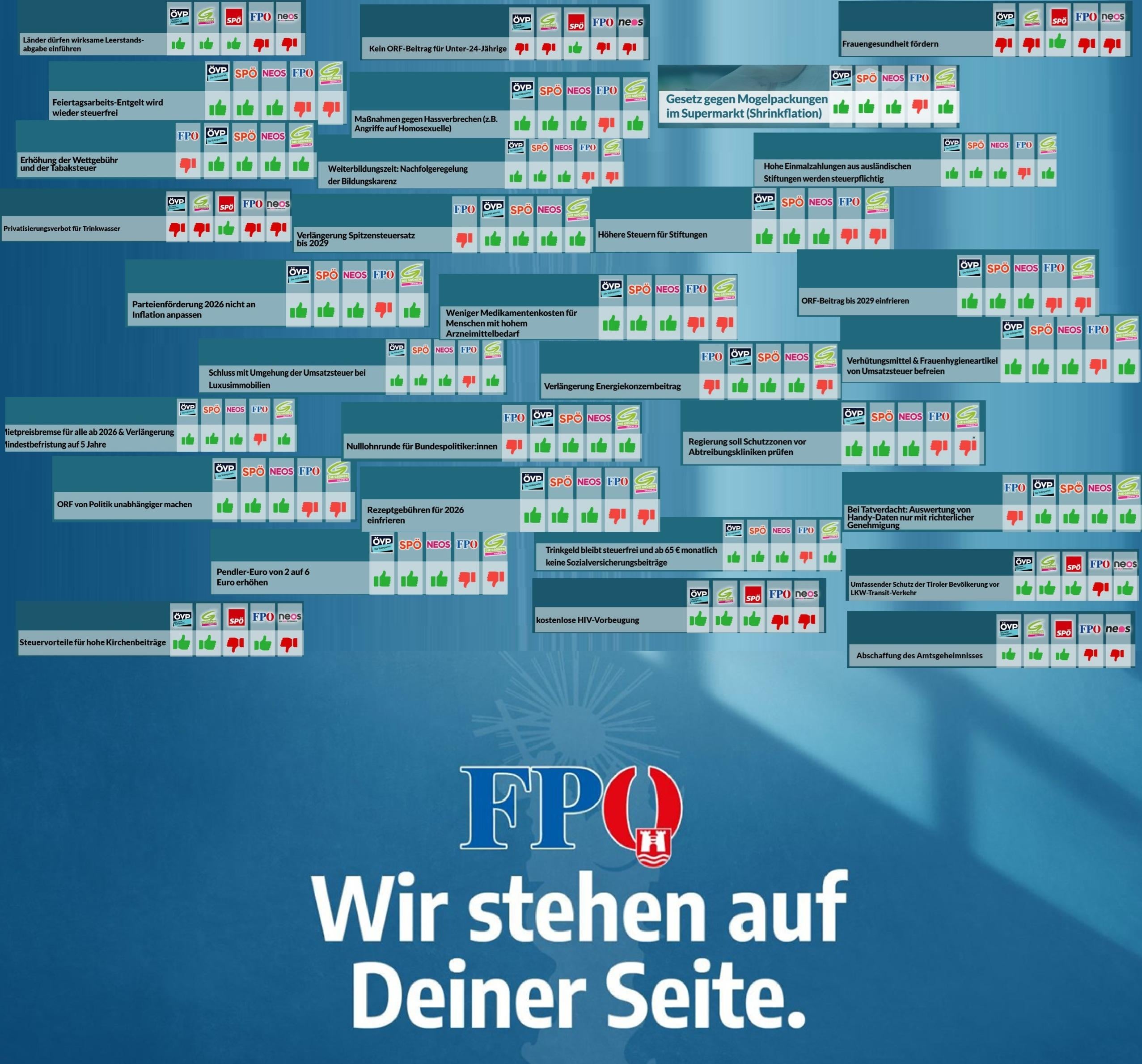 Auffallen tuts mir auf Anhieb bei der ORF Gebühr. Die FPÖ ist da traditionell dagegen, hat aber gegen Einfrierung bis 2029 gestimmt. Ging ihnen das nicht weit genug? Wäre ein völlig anderer Grund, als “Wir finden die Gebühr ja eigentlich geil”.