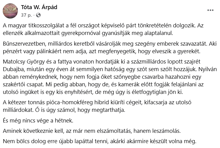 20 éve Tóta W-ben valami elpattant. Az utolsó utáni pillanatig Gyurcsány seggét nyalta. Régen friss, fiatalos újságíró volt. Aztán 15 évig szinte semmit nem láttam tőle. Most meg ez a Csurka-stílus, férgezés, fenyegetés, megtorlás. Komolyan kérdezem, ez jó irány?