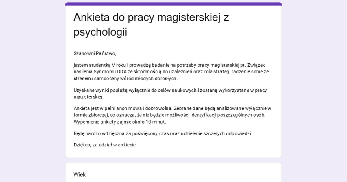 Cerco persone disposte a compilare una domanda. Riguarda ACoA, il figlio adulto di un alcolizzato. Esamina la tendenza alla dipendenza, all’autostima e alla gestione dello stress. Sarebbe grata per il tuo aiuto. Il sondaggio è anonimo. https://docs.google.com/forms/d/e/1FAIpQLSc552jpbQn1x_TLXOWSouyo0LZuvz5JLNNu1VnwT5J5JmWjRQ/viewform?usp=sharing&ouid=111863899173830004687