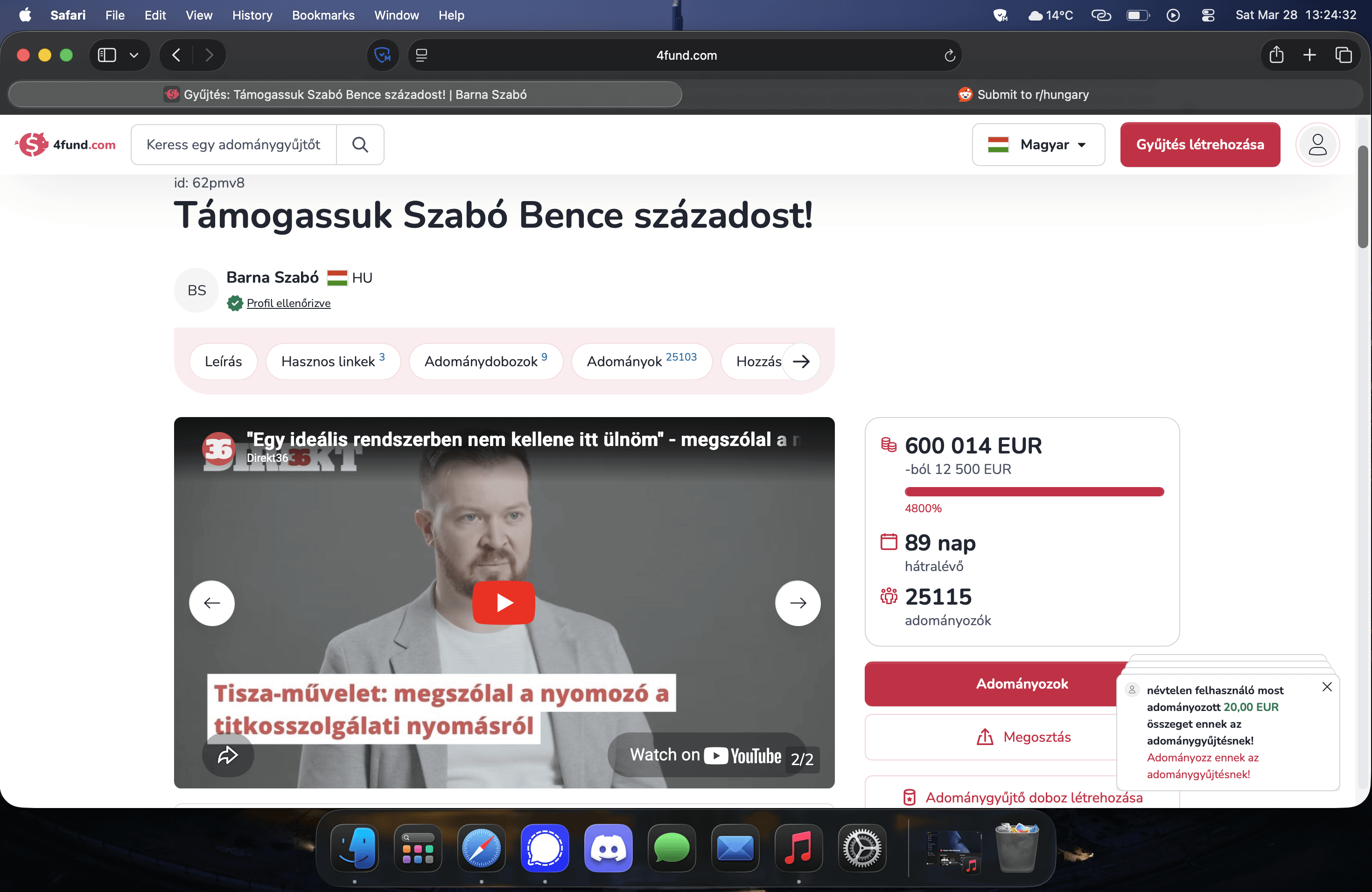 Tokre megerdemli es szuper de amugy mi a cel? Millio eur? 2millio? Miert nem adakoztok mondjuk a direkt36nak, atlatszonak, transparencynek, partizannak, azoknak akik nem egyszer alltak ki hanem evek ota folyamatosan? Johetnek a downvote-ok csak eszembe jutott hogy a magyarok ilyenek, vagy telibeszarnak mindent vagy a fejukhoz kapnak es tulkompenzalnak…