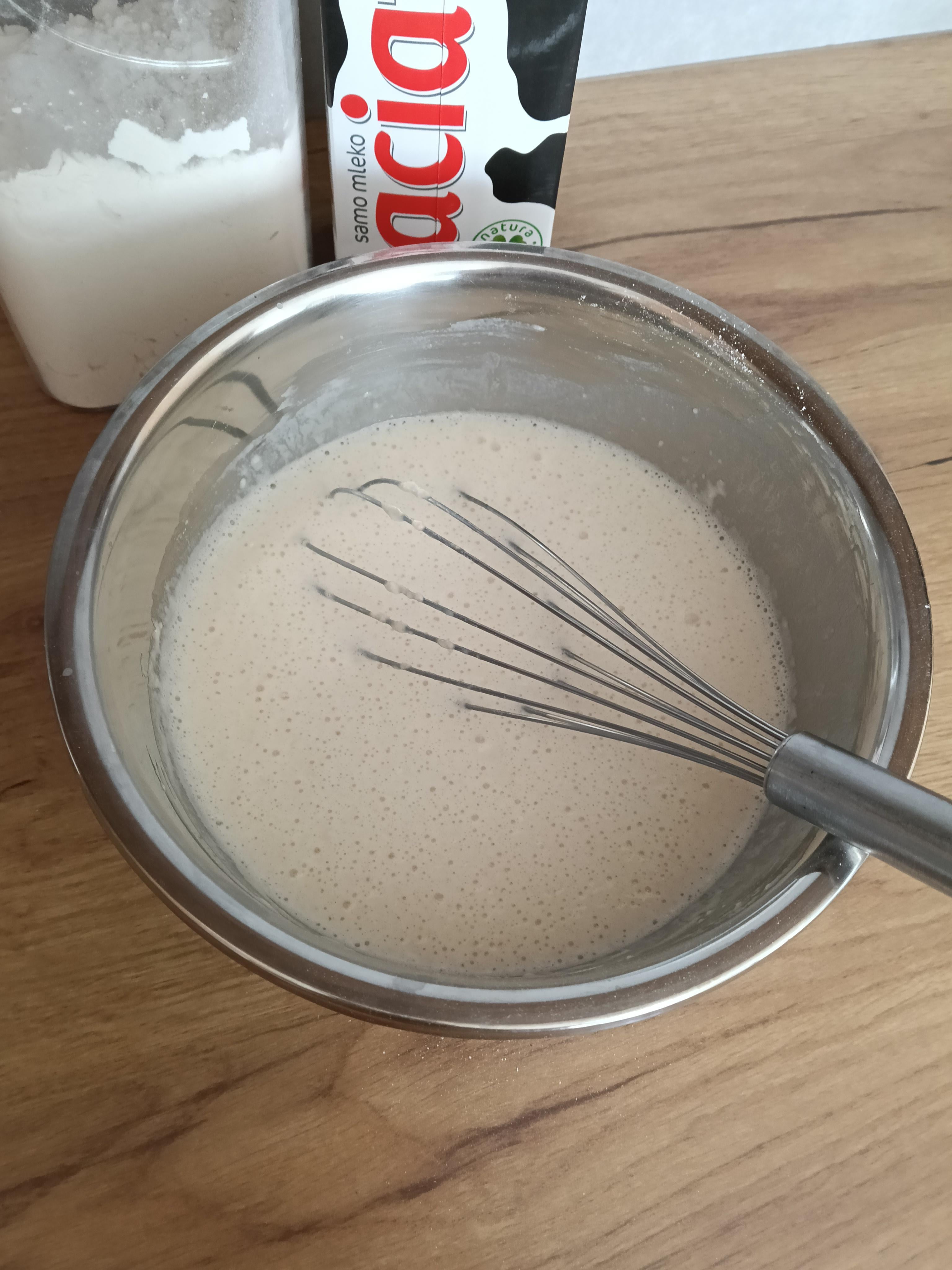 2 jajka, 300ml wody, 200ml mleka, 200g mąki, 2łyżki oliwy, łyżka cukru, 1g soli