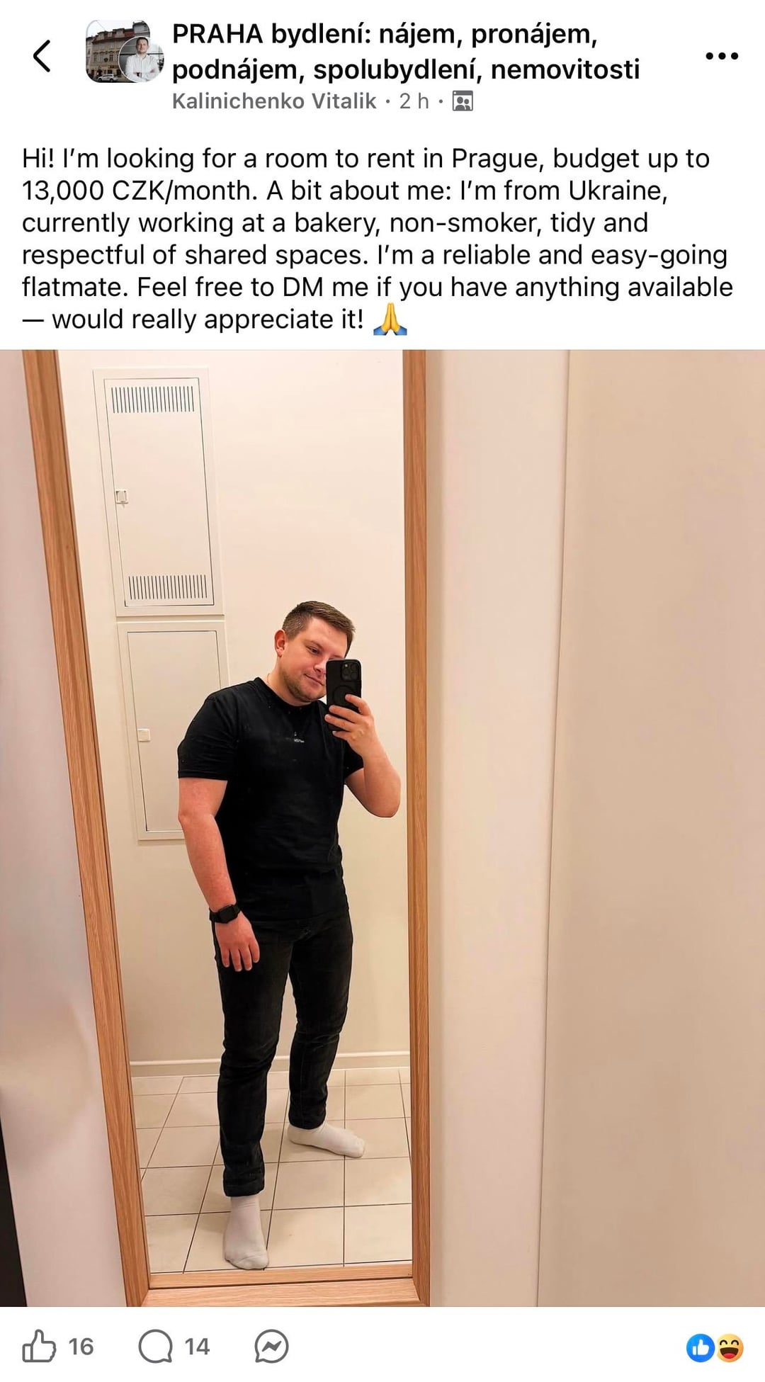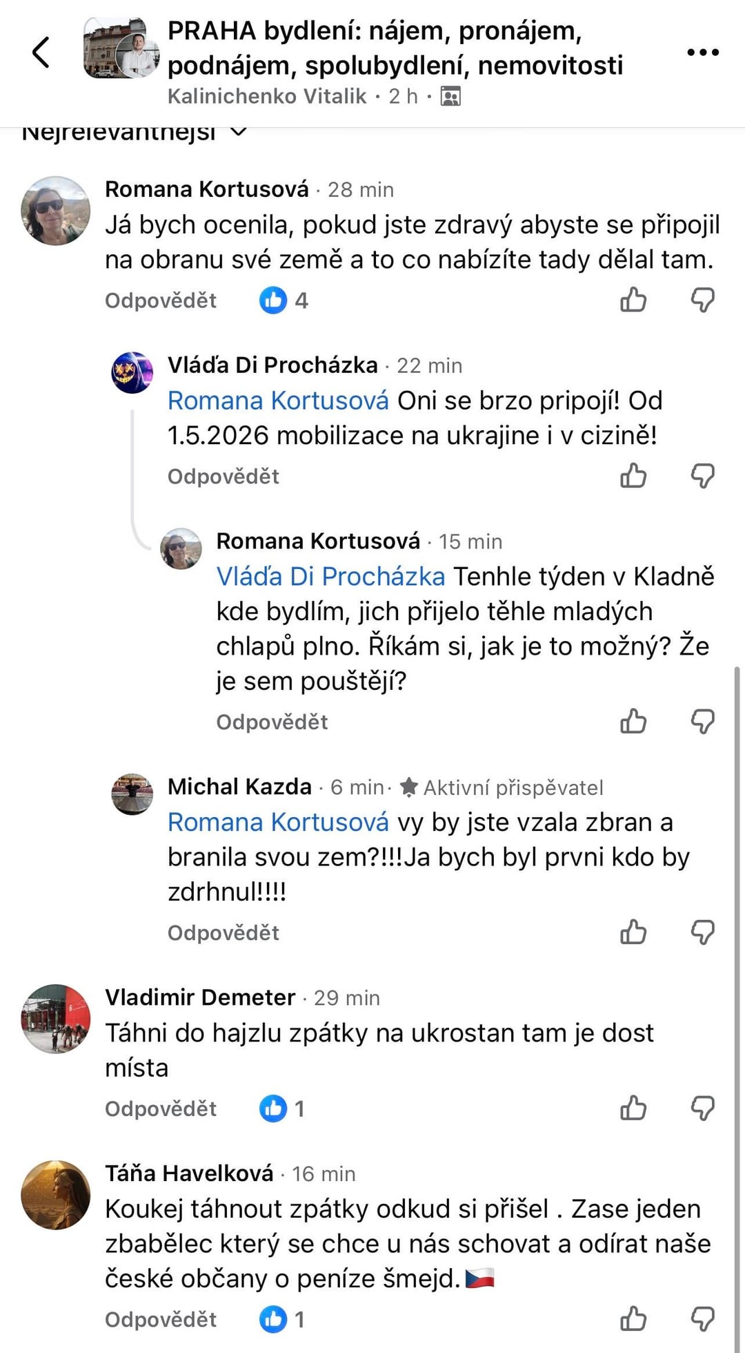 Ještě víc mě to šokuje, když na mě na facebooku vyskočí random post v ukrajinštině, kterou běžný čech nemůže přečíst, je to něco jako třeba “připravují se změny v režimu pobytu, víte, jak to bude vypadat? Více informací se dozvíte dále v postu” a pod to úplně automaticky pavlovovým reflexem napíše Čech, nebo třeba 300 Čechů s 500 komentáři “Zasraná usranina!!!” “Ať táhnou!!!” “[blicí smajlík]” “Žlutomodrý hadr!!!”