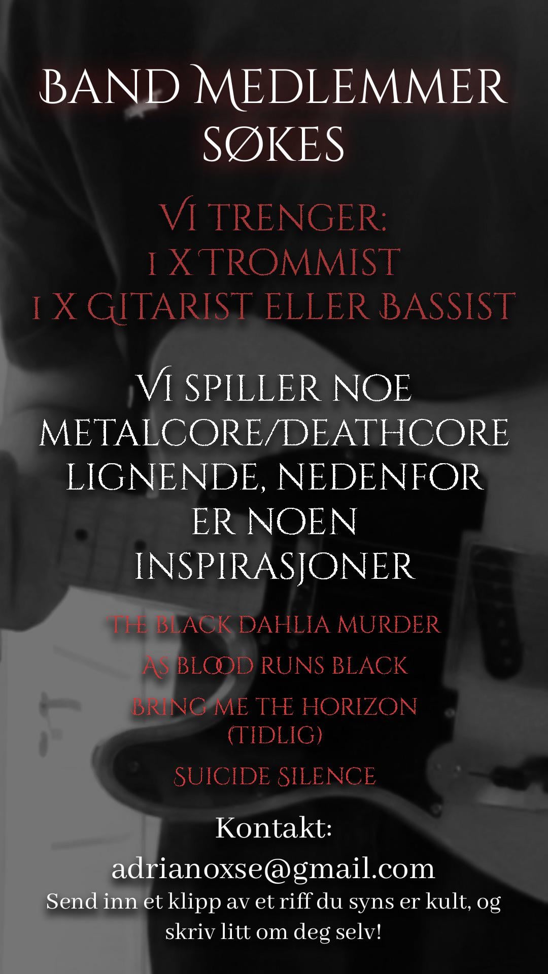 Ciao! Siamo una band locale di Stavanger che suona deathcore/metalcore come, ad esempio, As Blood Runs Black e The Black Dahlia Murder. Cerchiamo qualcuno che suoni la batteria e la chitarra o il basso nella nostra band! Non devi essere super bravo, assicurati solo di voler fare qualcosa di pesante! Se sei interessato, puoi inviarci un’e-mail (o scriverci qui tramite dm) dove scrivi qualcosa di te e aggiungi un file video/audio in cui suoni qualcosa di interessante!
