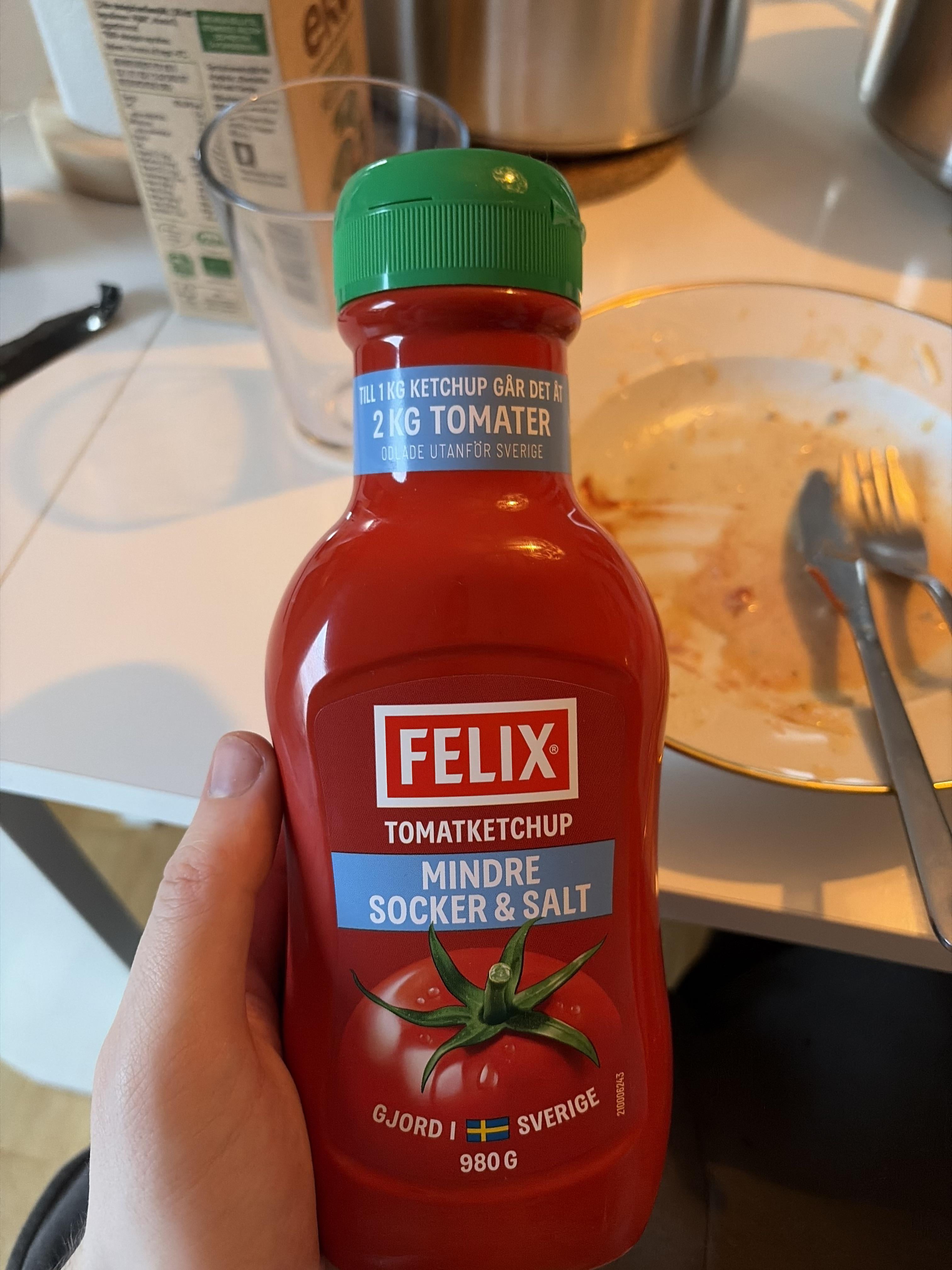 Seduti qui in tutta tranquillità a tavola, avevo appena mangiato gli spaghetti al sugo di carne macinata, le figlie avevano mangiato e io ho avuto un ultimo momento tranquillo prima di sparecchiare. I miei occhi sono attratti da una superficie azzurra sul ketchup dove c’è scritto "coltivato fuori dalla Svezia"si arrabbiò completamente irragionevolmente,"che diavolo" Ho gridato ad alta voce, alzandomi e agitando il pugno, il ketchup di Felix dovrebbe essere svedese, giusto?!