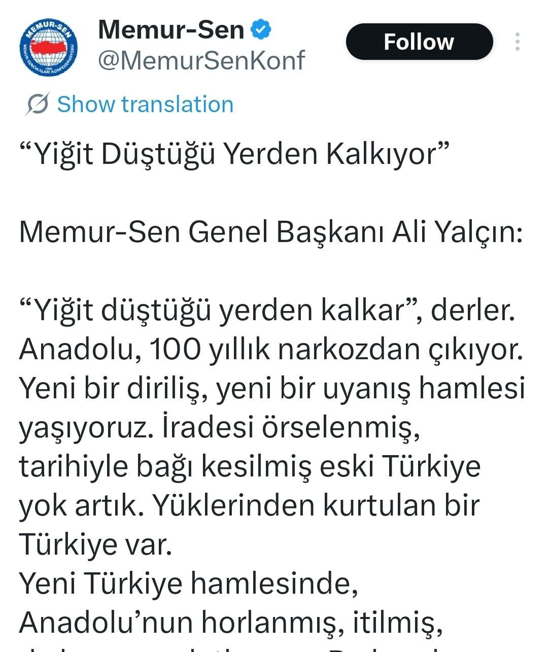 Memurların temsilciligini yapması gerekirken on yıllardır burjuva gibi yasayan (sendikacılarin lüksü bakanları bile aşar bazi yerlerde) adama da bak sen. Anadolu halklarindan falan bahsediyor