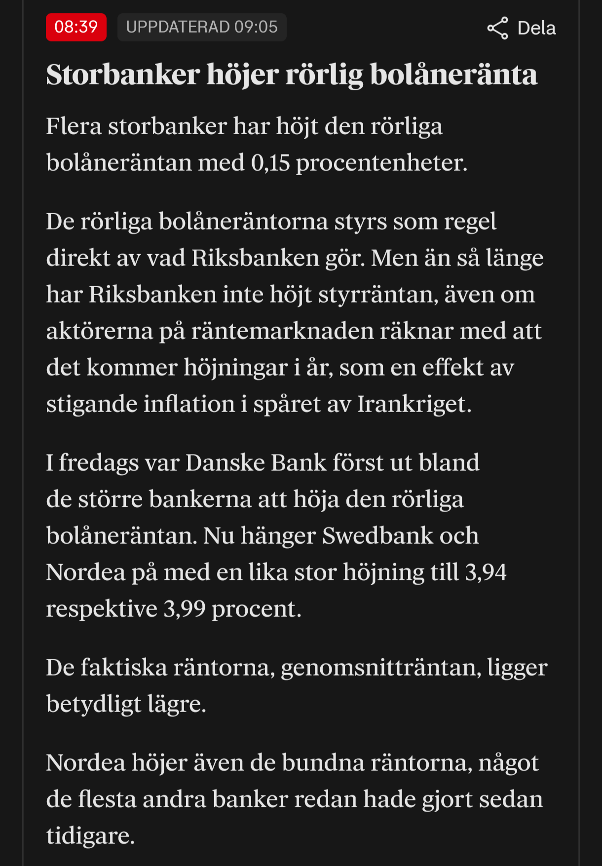 Dopotutto, raramente ABBASSANO il tasso di interesse prima che il tasso debitore della Riksbank venga abbassato. Ma ora scelgono di aumentare il tasso di interesse dei clienti senza alcuna ragione basata sulla speculazione. Possono guadagnare qualche soldo in più da noi schiavi dei mutui.