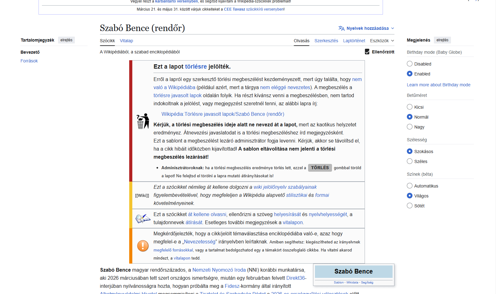 Se hai dei dubbi, puoi vederlo con i tuoi occhi.) UN Fidespedia La Wikipedia ungherese ha contrassegnato ieri per la cancellazione la voce recentemente creata sul Capitano Bence Szabó, l’eroe nazionale ungherese, che mette in dubbio la "notorietà".