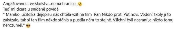 Sranda taky je, že by bez Putina nikdy nevznikl, protože ty natočené záběry vznikly kvůli tomu, že režim chtěl od škol videoreporty, že tam ta nařízená propaganda opravdu probíhá.