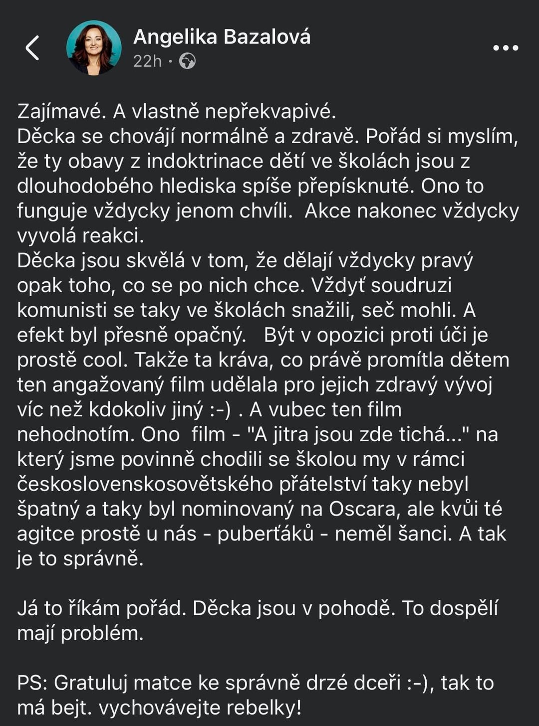 Politika do školy nepatří, tečka. Do školy patří objektivní výchova v souladu se společenskými normami, tzn. patří tam tvrzení, že války a zabíjení jsou zlo (byť třeba i s pozitivními účinky, ale pořád zlo). Absolutně tam nepatří tvrzení, jestli je agresor Putin, nebo Zelenskyj, nebo Trump, nebo Pavel. Na toto nikdo ve školství nemá znalosti, aby cokoli takového mohl prohlašovat. A názory do vzdělávání nepatří.