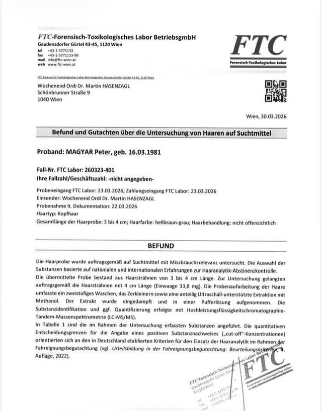 A vizsgálatot egy bécsi, nemzetközi standardok szerint működő labor végezte, amely kifejezetten drog-, alkohol- és gyógyszervizsgálatokra specializálódott, és eredményeit hatósági és jogi eljárásokban is használják.