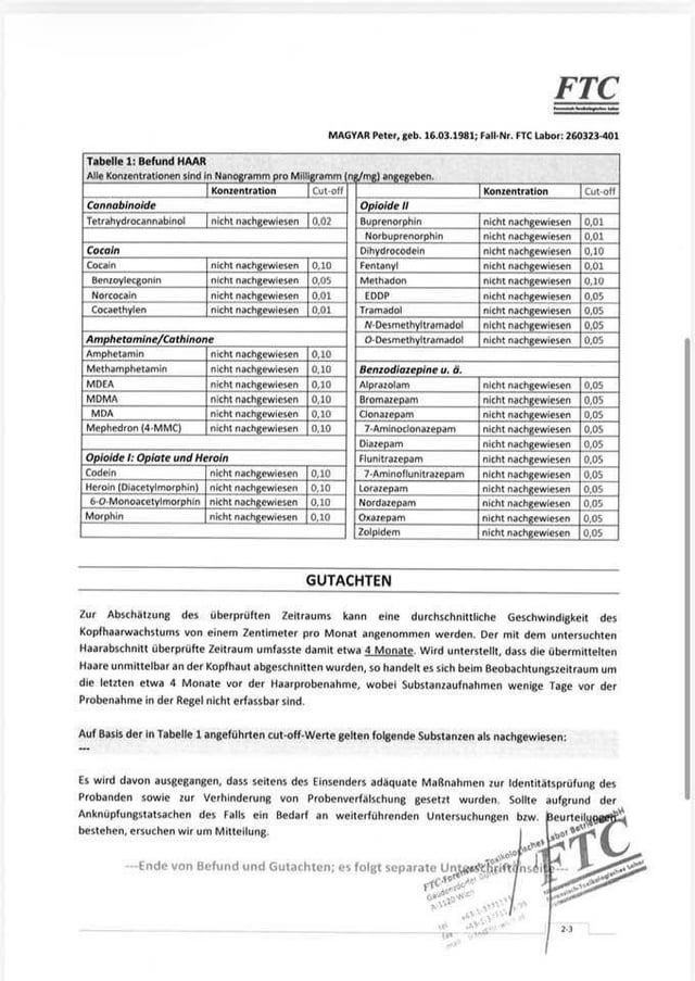 Az akkreditált osztrák labor által végzett vizsgálat eredménye 100 %-os bizonyossággal megmutatja hosszú hónapokra visszamenően, hogy semmilyen drogot nem fogyasztottam.