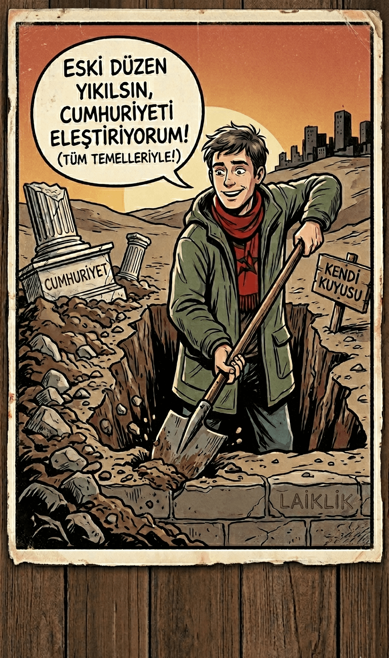 Ya git bir kardeşim ne cumhuriyet eleştirmesi? Cumhuriyeti savunan en büyük kitle solcular şu an. Türkiye’nin en büyük cumhuriyetçi partisi TKP iken sorun SOL mu kanka? Ne kadar rahat bu sola sallamak ya. Yapay zekayla görsel yapayım oturduğum yerden, laiklik için, cumhuriyet için bir şeyler yapmaya çalışanları eleştireyim. Götünü kaldırıp bir omuz da sen vereceksin ki polemiğe girme hakkın olsun.