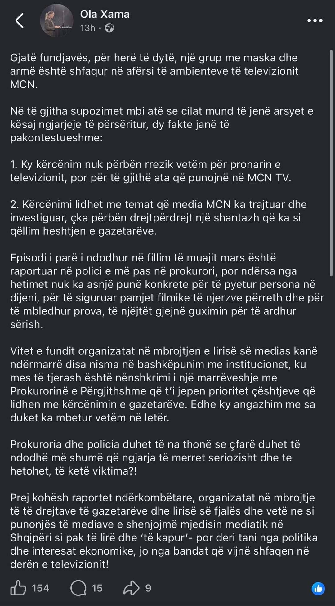 In secondo luogo, non appena questi resoconti sono stati resi pubblici, il giornalista Ola Xama denuncia che gruppi con maschere e armi circondano i locali della televisione MCN a scopo di ricatto.