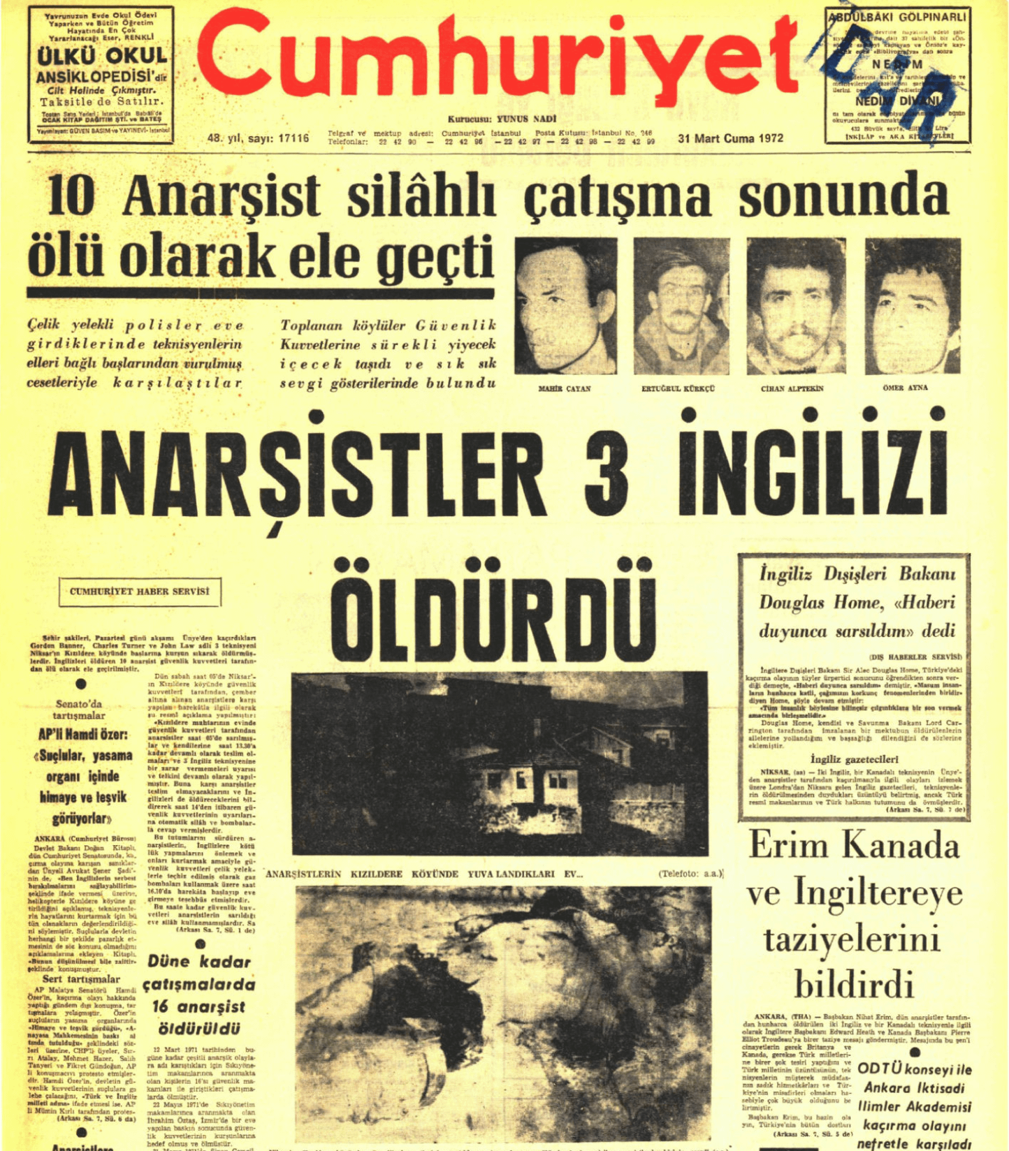 Il 26 marzo 1972 tre tecnici della NATO, uno canadese e due britannici, che lavoravano nella base Ünye Radar di Ordu furono rapiti.