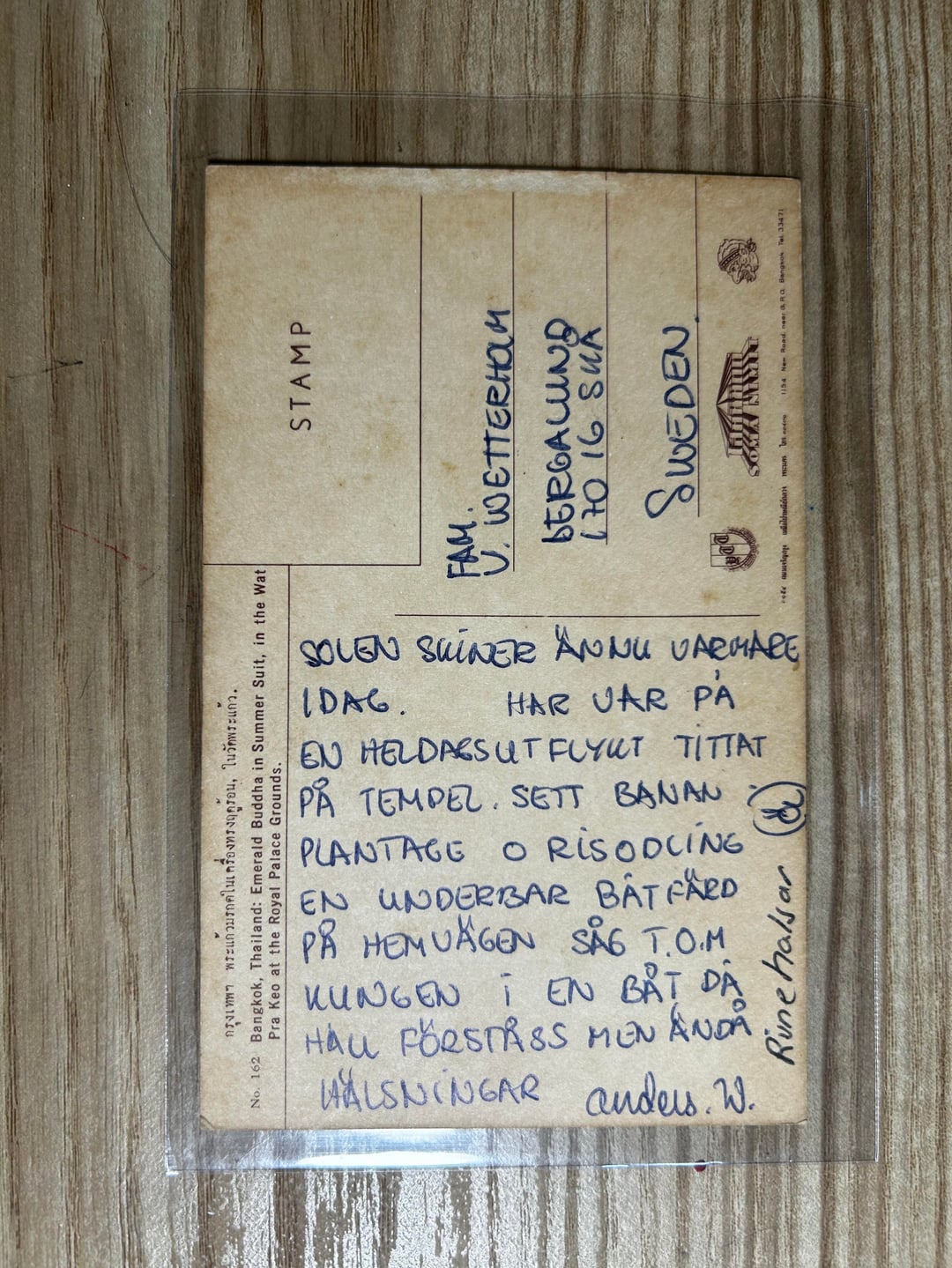 Ciao a tutti, vengo dalla Tailandia e recentemente mi sono imbattuto in una vecchia cartolina alla fiera del libro. È stato spedito dalla Tailandia alla Svezia e sto cercando di trovare la famiglia a cui era indirizzato. Mi sono sentito un po’ male dopo averlo acquistato e vorrei che lo ricevesse il destinatario dato che non gli è stato inviato. So che è un azzardo, ma ho pensato di provarci: qualcuno qui riconosce il nome o conosce qualcuno la cui famiglia viveva a questo indirizzo? Vorrei restituire questa cartolina (o almeno condividerne una foto). Dal momento che sembra un pezzo della memoria di qualcuno.