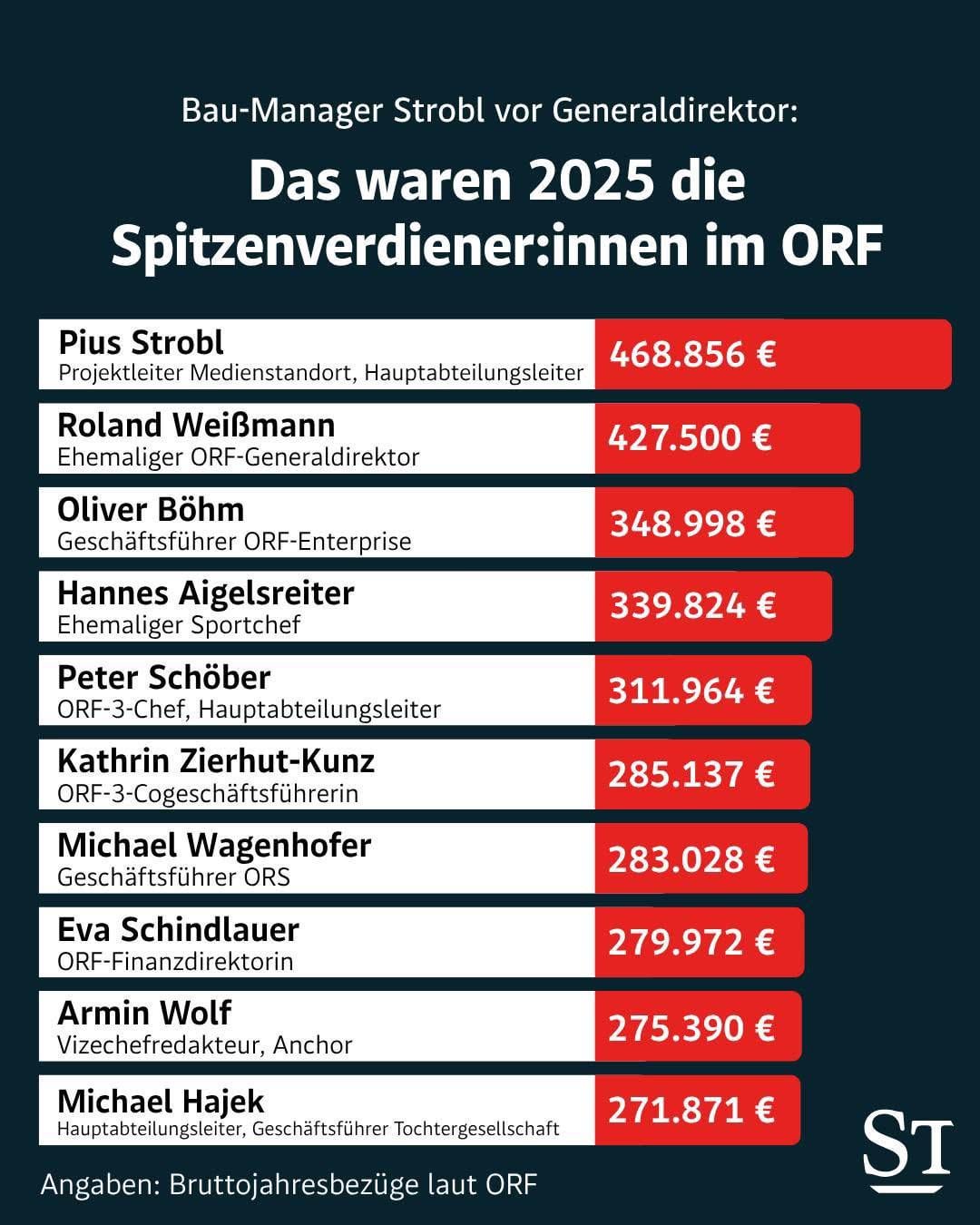 Quasi 470mila euro di stipendio annuo per Pius Strobl, coinvolto in diverse polemiche. A parte le altre somme utopistiche. Ciò solleva seri interrogativi in un’emittente finanziata con fondi pubblici. Come possono essere giustificati tali stipendi? Dov’è la trasparenza?