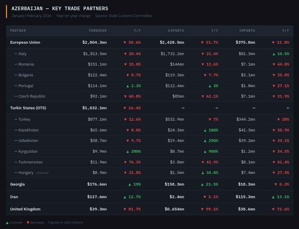 Sono disponibili i dati commerciali dell’Azerbaigian per il periodo gennaio-febbraio 2026 e i numeri sono sorprendenti. Commercio con l’UE 🔻30,6% a 2,8 miliardi di dollari. Commercia con il Regno Unito🔻81,7% a soli 39 milioni di dollari, mentre le esportazioni verso la Gran Bretagna crollano del 99,1% a 654.000 dollari. Pazzo.