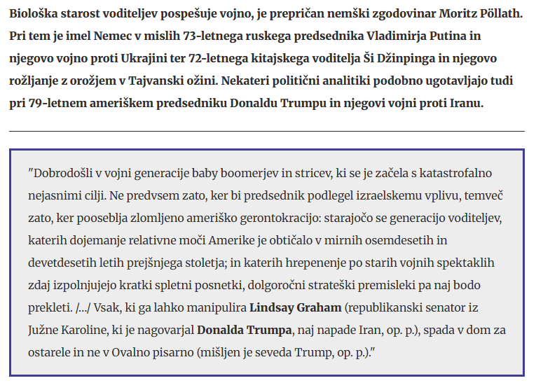 Ci stavo già pensando. Il mondo vuole essere plasmato da vecchi senili che non riescono ad accettare di avere solo pochi anni da vivere su questo pianeta, vivono nel 19° secolo e spingono l’imperialismo perché vogliono passare alla storia in ogni modo possibile come i leader che hanno risanato il loro paese "una superpotenza". Che tipo di mondo lasceranno dietro di loro incombe su di loro.