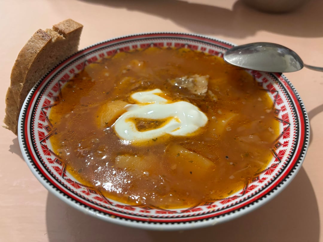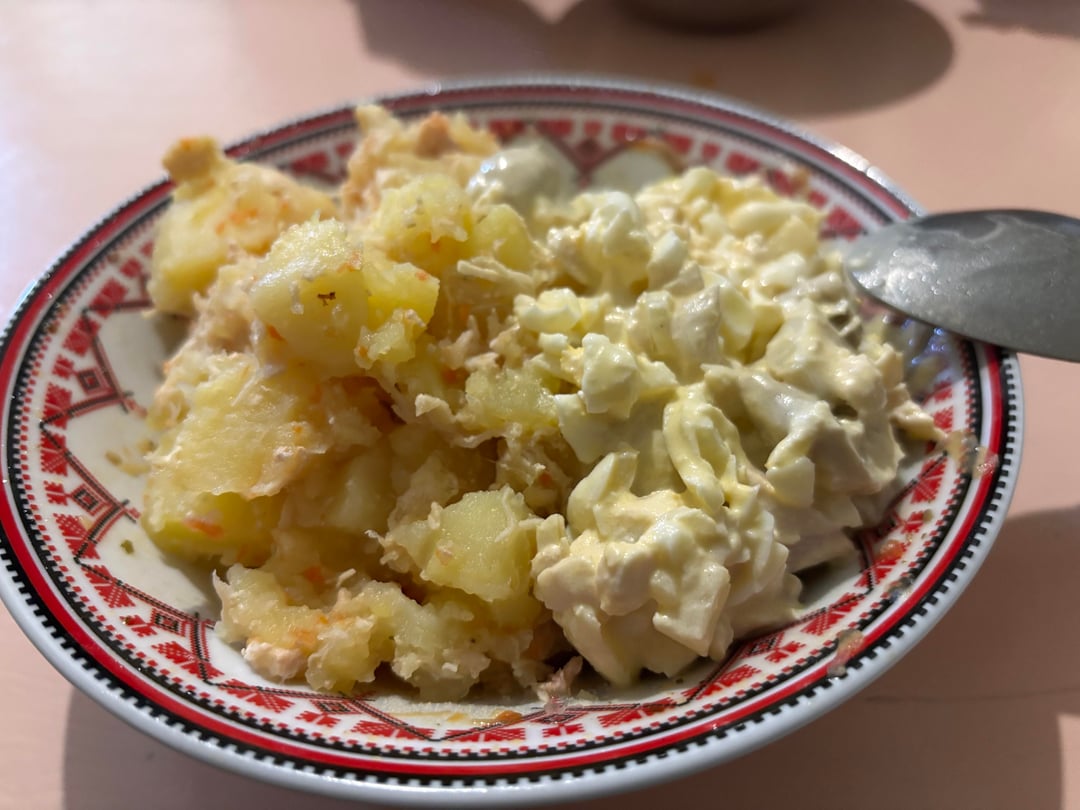 Pranzo di oggi nella mia unità militare da qualche parte in Ucraina: borscht rosso ucraino con smetana, patate bollite con carne e insalata (pollo, uova, ananas, cipolla, maionese)