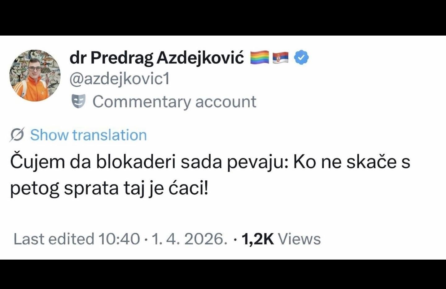 Mislim da bilo koji alfabet mafija aktivista u Srbiji treba debelo da se ogradi od ovog (ne mogu reci coveka) jer je on jedan od aktivista i ljudi u njemu vide nekog predstavnika manjine