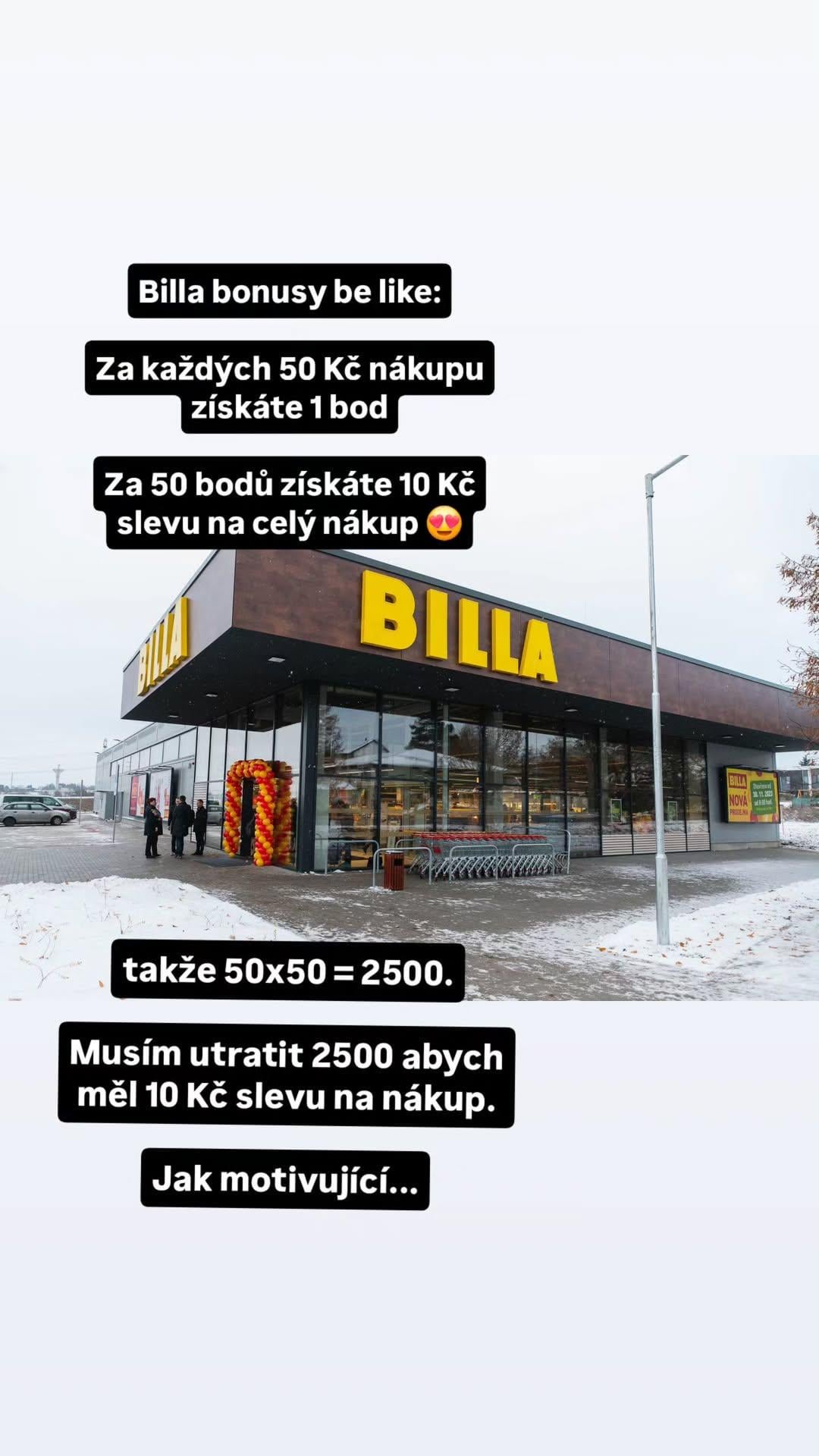 Billa je největší scam obchod i s tou kartičkou je to tam přepálený. Minulej rok v létě 20 minut před zavíračkou tqm měli bedýnku jahod 1kg. Když jsem šel ráno okolo, řikal jsem si, že ty jahody jsou tak do zejtra a pak se rozložej. Bedýnka byla za 139,- nevzal jsem si ji. Jdu po práci okolo a jdu tam juknout. Jahody už se pomalu rozkládají je jich tam od oka tak 70-80 beden a sleva byla na 119,-. Kurvy to prostě raději nechaj uhnít a zplesnivět a pak to vyhoděj, než sby to dali třeba za 50,- v takovém bych si ty bedny vzal klidně 3, jahody si přebral a zamrazil.