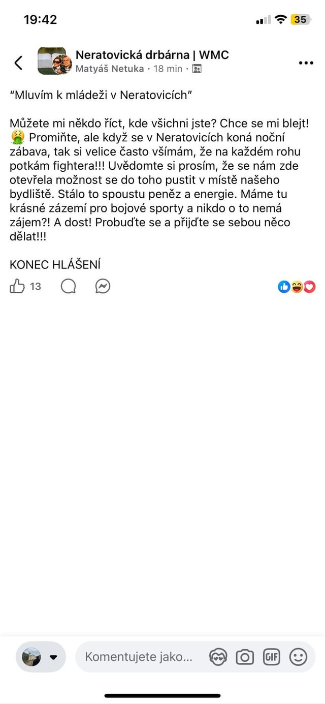 “Na každém rohu potkávám fightera” je docela vtipný vzhledem k tomu že v Neratovicích se docela často pořádají turnaje Karate hned několika asociací 😛