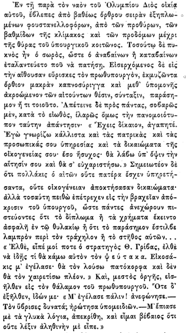 >*”Εις στιγμήν ψυχικής διαχύσεως, ο Κωλέτης είπεν εις στενόν φίλον του, ότι αδίκως του προσάπτεται η μομφή, του απατάν τους πάντας δι’ υποσχέσεων και παρασημοφοριών. Ουδείς εχέφρων δυναται να διίσχυρισθή τούτο, έλεγεν, αλλ ‘ όταν καθ’ην στιγμήν τα πράγματα εισί τόσον ανώμαλα μετά την Σεπτεμβριανήν επανάστασιν (σημειωτέον ότι ο Κωλέτης ουδέν έλαβεν μέρος εις ταύτην, ούτε εγνώριζε κάν την ύπαρξιν της συνομωσίας) όταν το Έθνος πιέζεται υπό όλας αυτάς τας στάσεις των οπλαρχηγών και των ασυντάκτων στοιχείων, (έπανειλημμένως τότε έστασίαζον , πότε μεν ο Γρίβας, πότε ο Κριεζώτης , ο Παπακώστας και άλλοι) ότε έχω ανάγκης και μιάς ψήφου ακόμη εν τη Βουλή και τη Γερουσία, και εν τούτοις ευρίσκονται φίλοι μου πολιτικοί με τόσον ολίγον νούν, και με τόσην ολίγην συναίσθησιν της αξιοπρεπείας των, και της υψηλής θέσεώς των, ώστε να μου ζητώσι θέσιν προξένου δι’ ένα άνθρωπόν των, όστις όχι μόνον ου γλώσσαν ξένην γνωρίζει, αλλά και την Ελληνικήν ομιλεί ατελέστατα, καταγόμενος εξ ‘Αλβανών, και επιμένουσιν, ενώ τοις εξήγησα τους λόγους, δι’ους δεν γίνεται, τότε βεβαίως αναγκάζομαι να υποσχεθώ, ότι όχι μόνον τούτο, αλλά και την Σελήνην και τους αστέρας δύναμαι να τους χαρίσω.”*