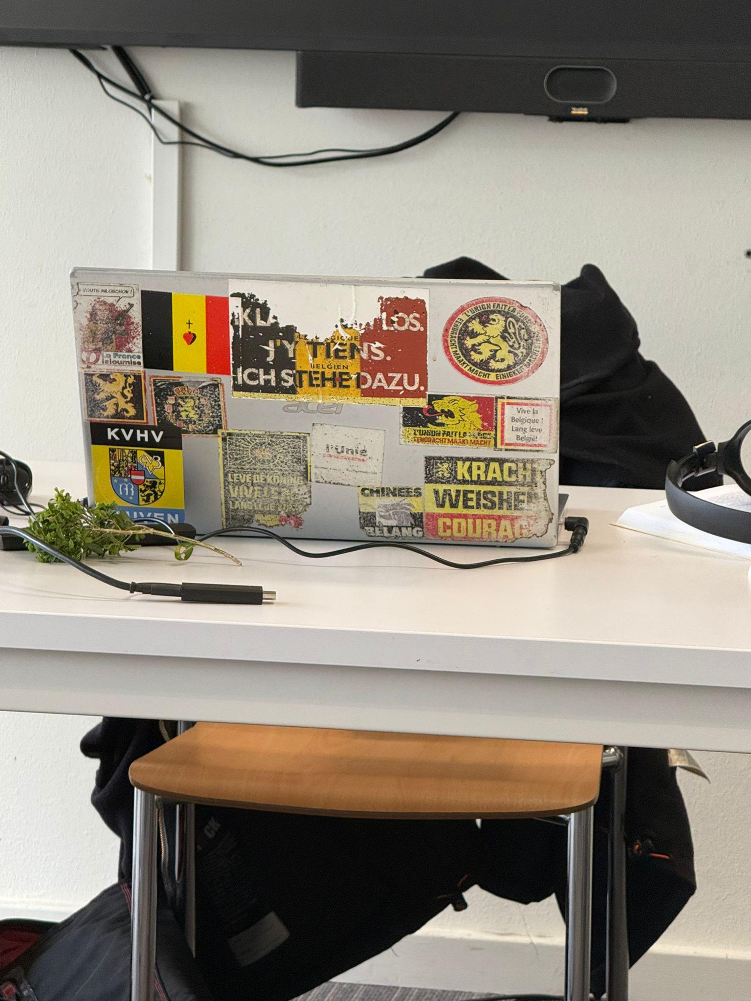 Seems like a politically confused person. Lots of Belgian patriotic stickers, but also KVHV Leuven, wich is very Flemish nationalist and anti-Belgian.