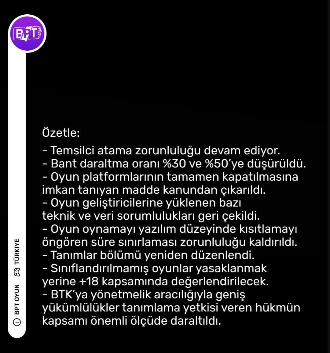Vazgeçiceklerini sanmıyorum çünkü ebeveyn kontrolü ve çocukları koruma muhabbetleri tüm dünyada konuşuluyor. Temsilci atama konusunda korkuyordum ama atanacak temsilcinin kim olduğu veya türk olması önemli değil sadece konuşulabilecek bir insan olsa yeter demişler ve bu yine iyi sayılır. Yaş derecesi almayan oyunlar direkt yasaklanıcaktı ama şimdi en azından derecelendirme alana kadar +18 olarak geçicek ki bu kadar oyuna derece atayana kadar tüm oyunlar kapatılacaktı. BTK’ya bu kadar yetki verilecekken bu yetkilerin geri çekilmesi yani platform kapatma ve %90 bant daraltmanın iptal olması da iyi sayılır ama %50 daraltma yine kötünün iyisi sayılır. Elimizden geldiğince kuralları değiştirmeye çalıştık ama anca bu kadar olmuş, şimdi sıra oyun dağıtıcı şirketlere baskı yapmakta (Steam temsilci atasın diye zorlamalıyız çünkü bu elemanlar dünyadaki hiçbir şeyi umursamıyorlar).
